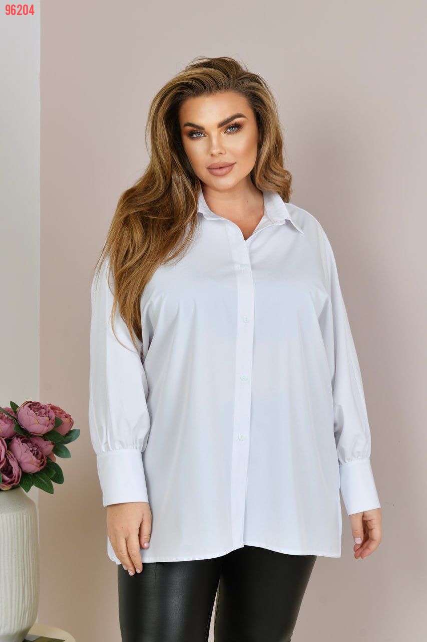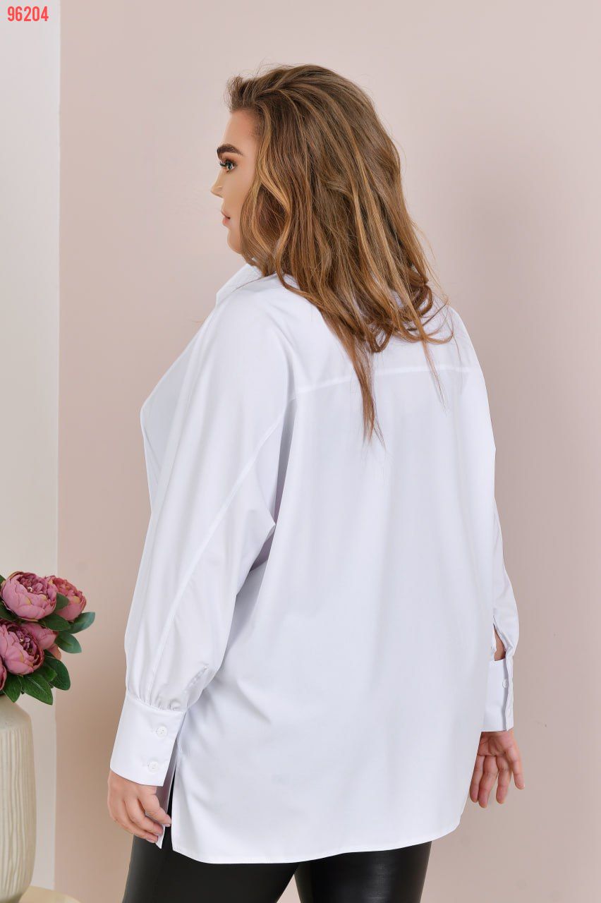 Блузка має прямий вільний та подовжений силует, рукав довгий цільнокроєний, на високому манжеті з гудзиком. Комірець зі стікою. Застібається блузка на гудзики по передній планці.