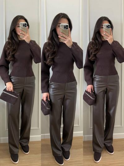Матові шкіряні штани вільного кроюВисока посадка ідеально підкреслить вашу фігуру, а подовжені штани візуально зроблять вас вище