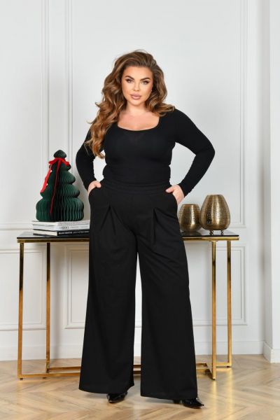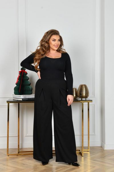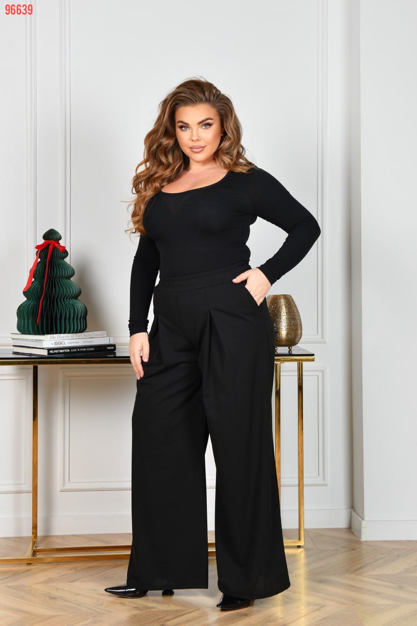 Стильні та зручні брюки-палаццо із трикотажного крепу (розтяжність середня). Брюки по лінії талії із защипами, зібрані на резинку, в бічних швах оброблені кишені.