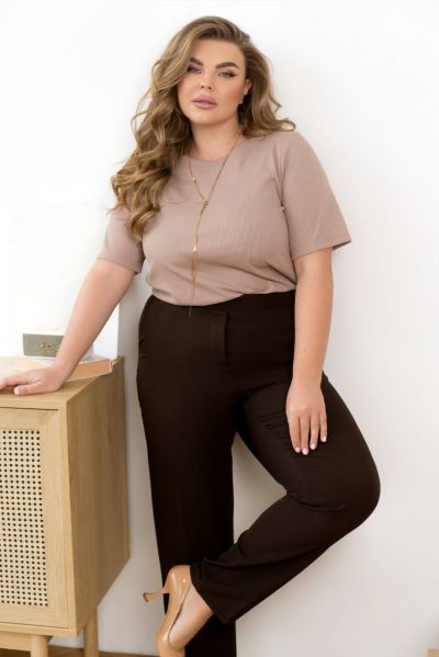 Зручні брюки плюс сайз з високою посадкою, до поясу ззаду вшито резинку, спереду - декоративна ширинка, з боків - кишені в шві. Без застібок.