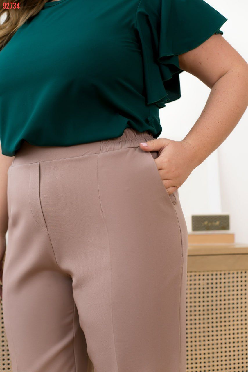 Зручні брюки плюс сайз з високою посадкою, до поясу ззаду вшито резинку, спереду - декоративна ширинка, з боків - кишені в шві. Без застібок.
