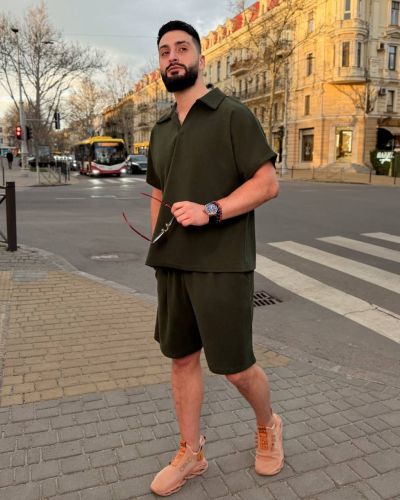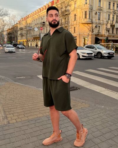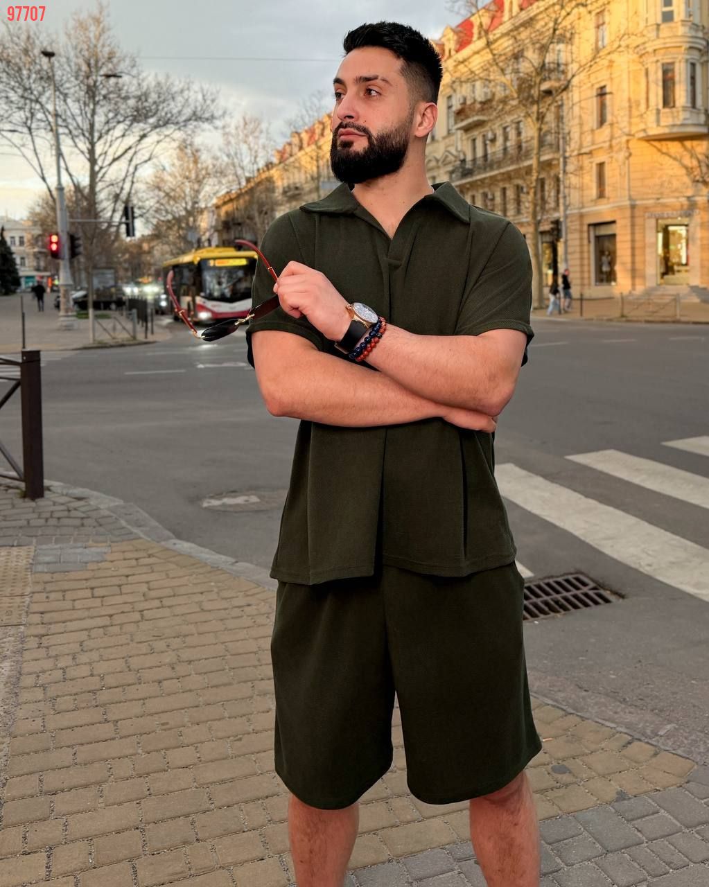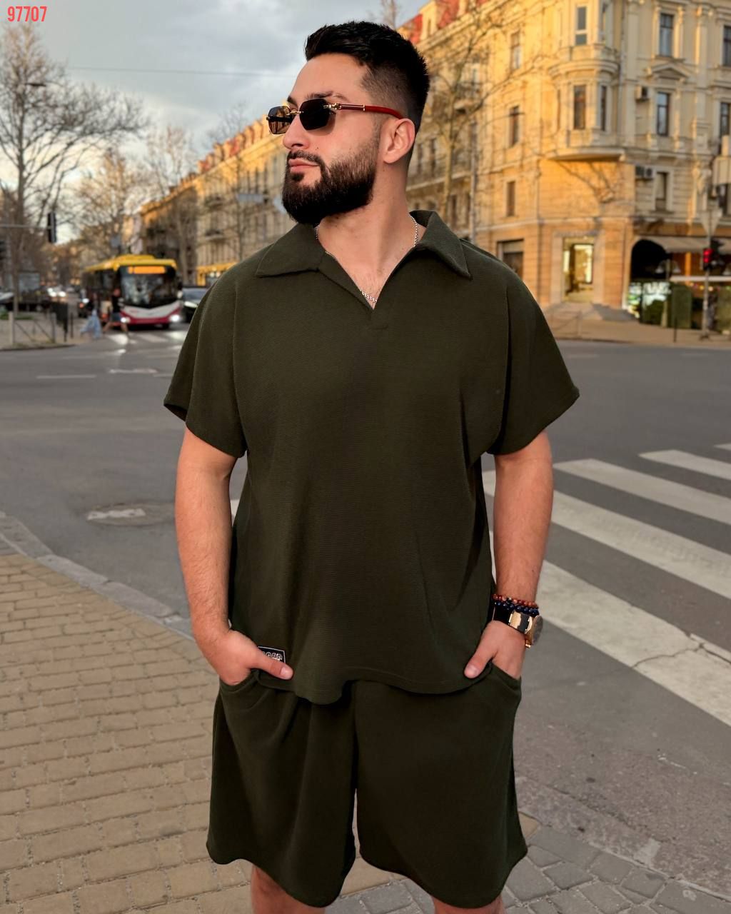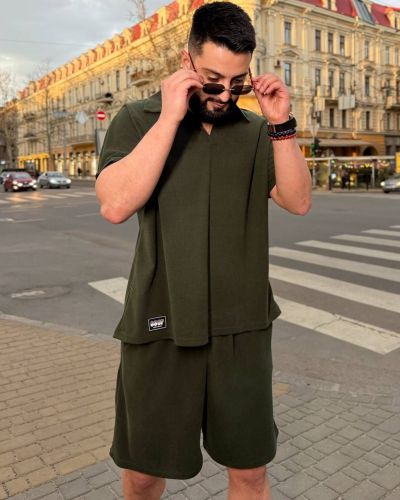 Стильний комфортний костюм з шортами з трикотажу еластан : футболка поло у стилі оверсайз з акс + шорти з високою посадкою з кішенями у бічних швах, з куліскою на поясі.