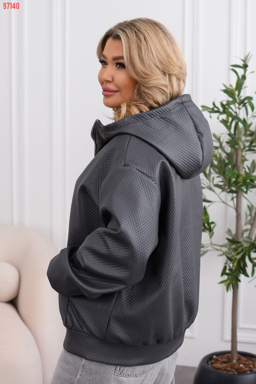Демісезонна куртка-бомбер must have: капюшон, водонепроникна еко-шкіра, два накладні кармани, підкладка. Мінімалізм, що тримає форму та рятує від вітру й дощу.