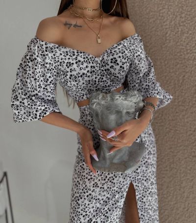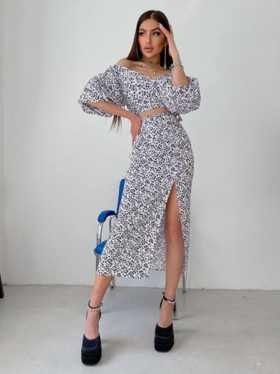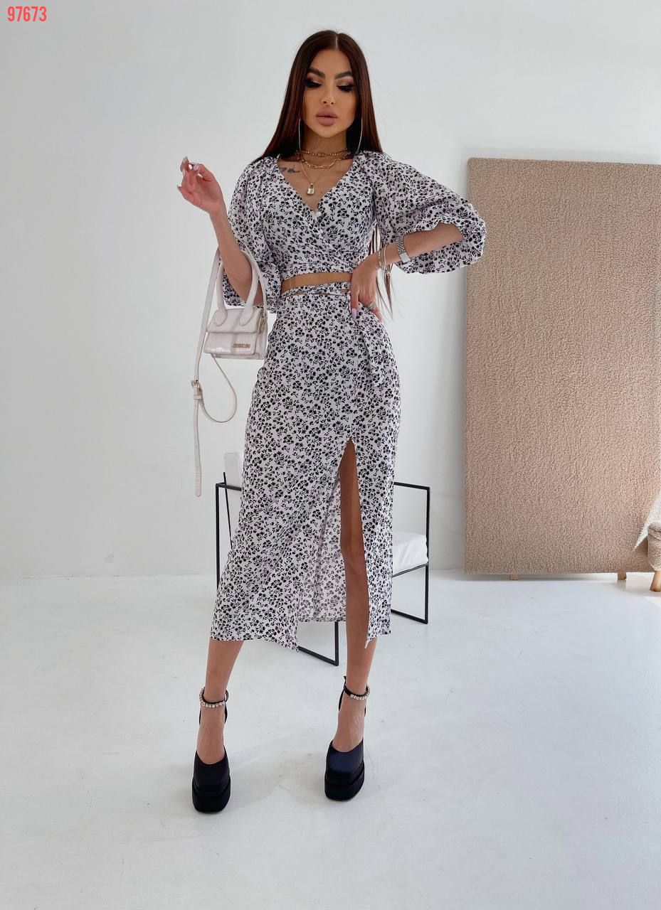 Ось і настали сонячні,теплі дні. ми вам пропонуємо шалено красивий і жіночний костюм, який складається з топу та спіднички з пікантним розрізом на лівій ніжці