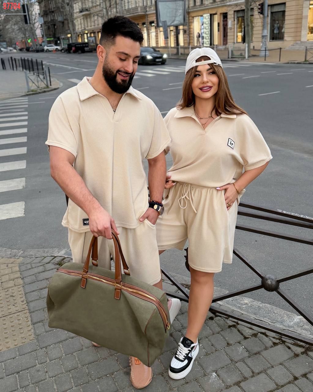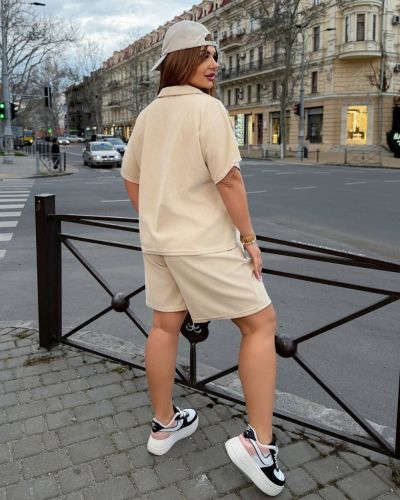 Стильний комфортний костюм з шортами з трикотажу еластан : футболка поло у стилі оверсайз з акс + шорти з високою посадкою з кішенями у бічних швах, з куліскою на поясі.