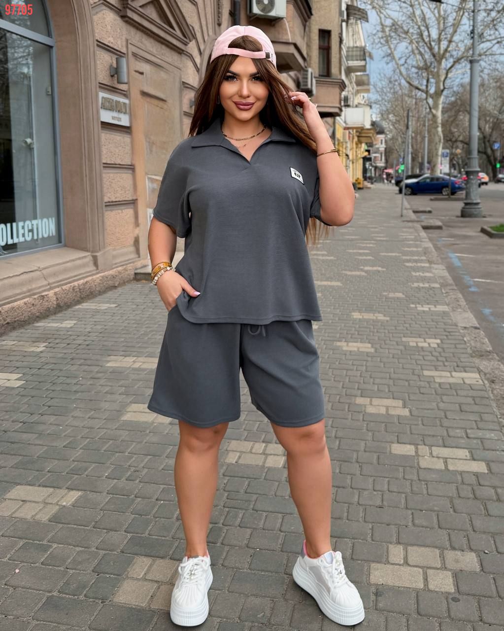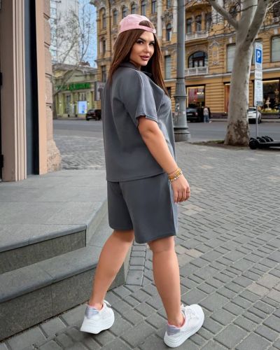 Жіночий стильний костюм з шортами графіт №97705