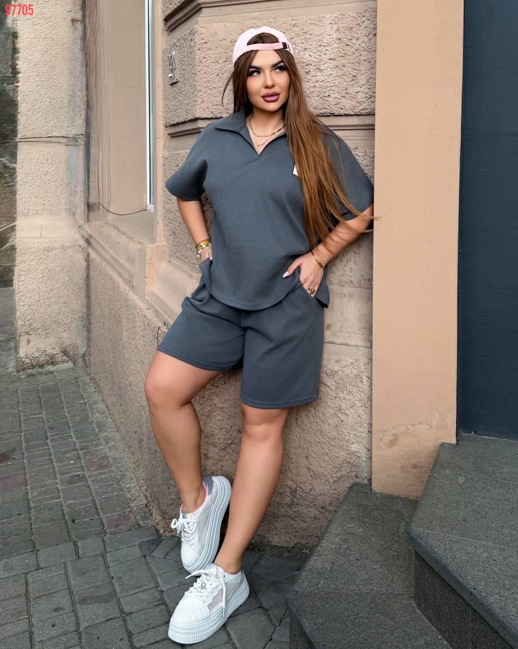 Стильний комфортний костюм з шортами з трикотажу еластан : футболка поло у стилі оверсайз з акс + шорти з високою посадкою з кішенями у бічних швах, з куліскою на поясі.