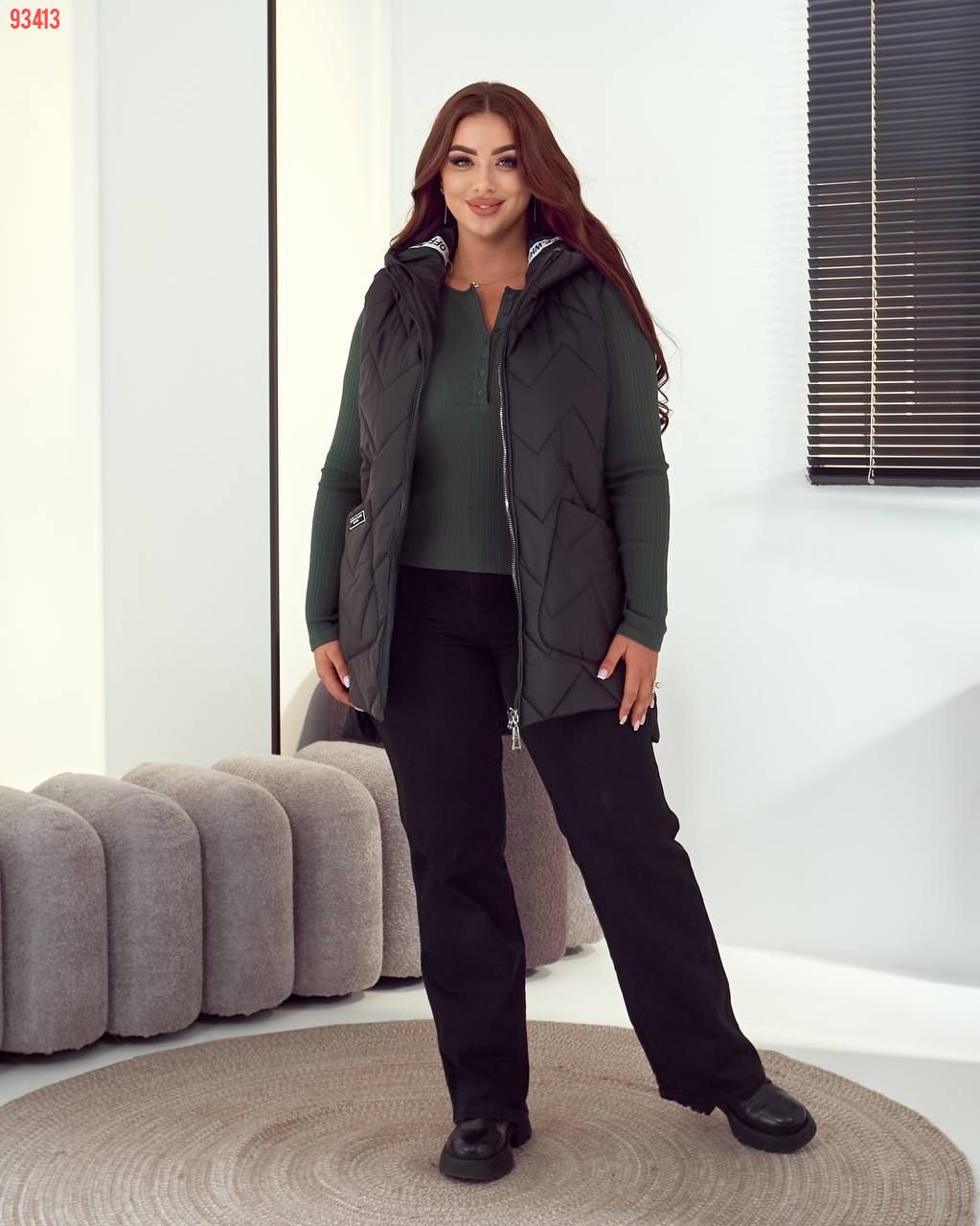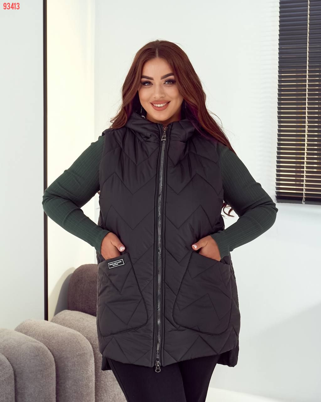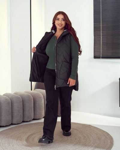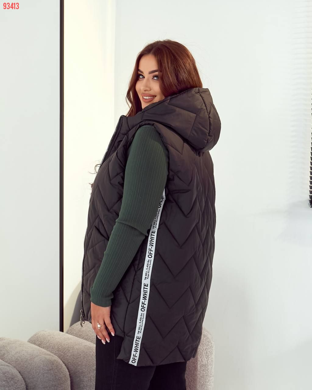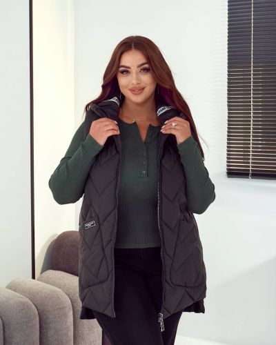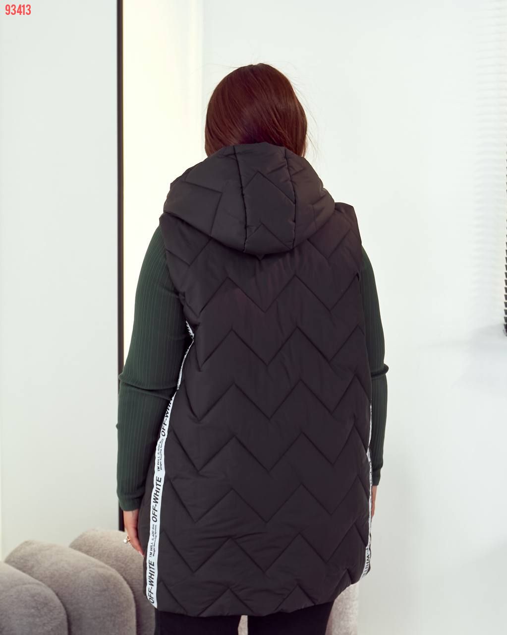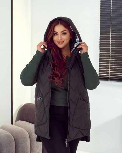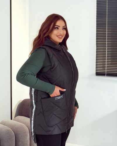Стильна стегана жилетка прямого крою з накладними кишенями, зручний глибокий капюшон, декорована лампасами, якісна фурнітура.