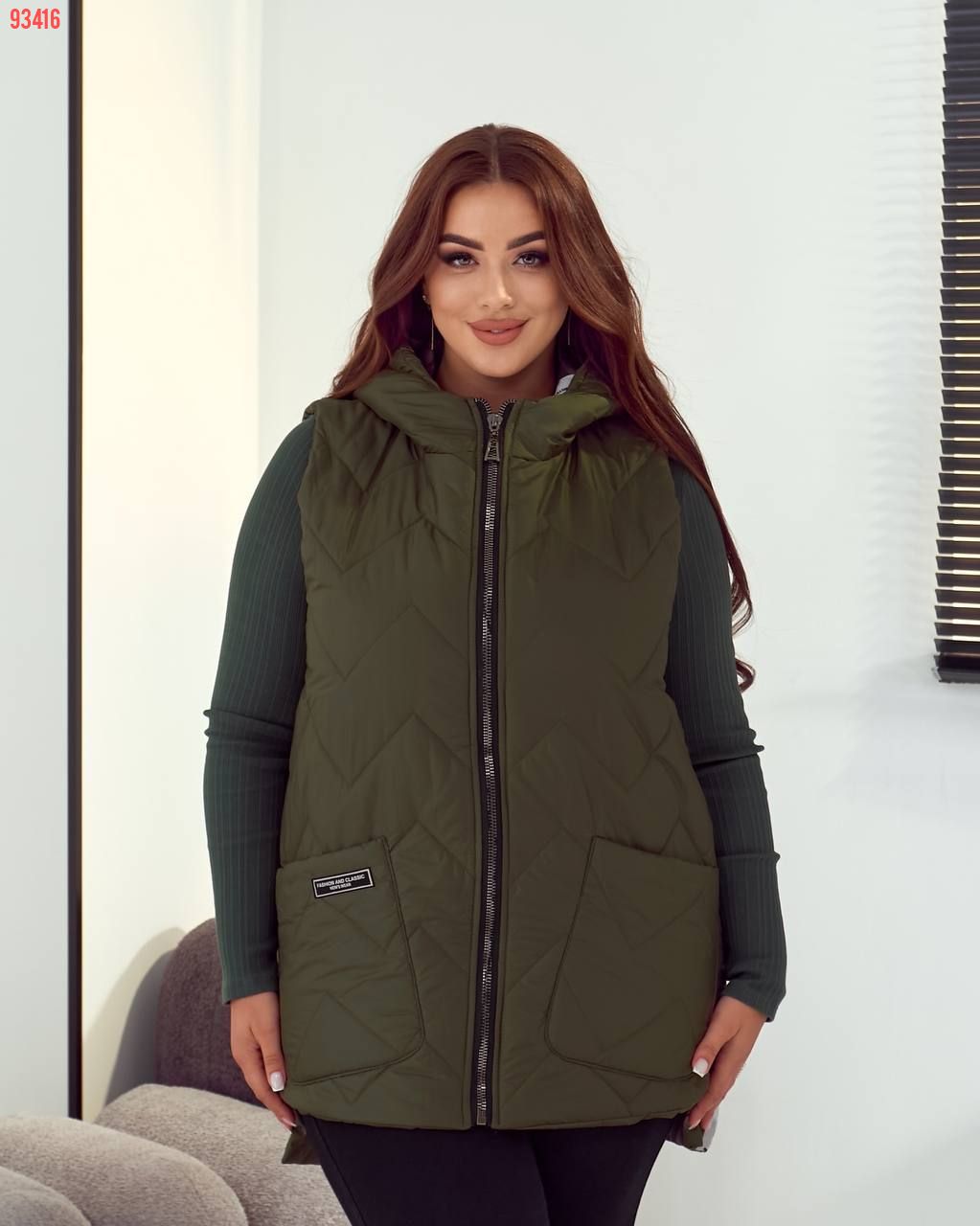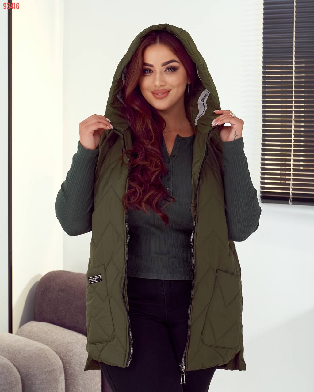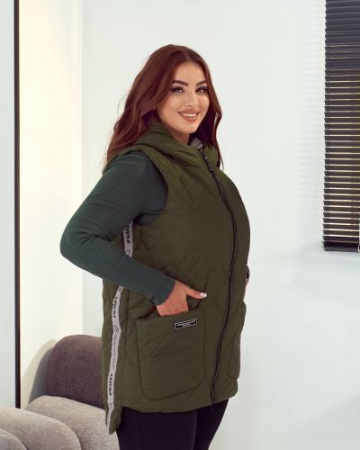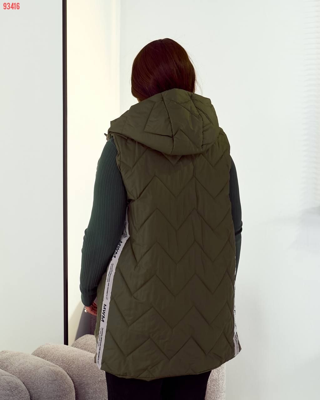 Стильна стегана жилетка прямого крою з накладними кишенями, зручний глибокий капюшон, декорована лампасами, якісна фурнітура.
