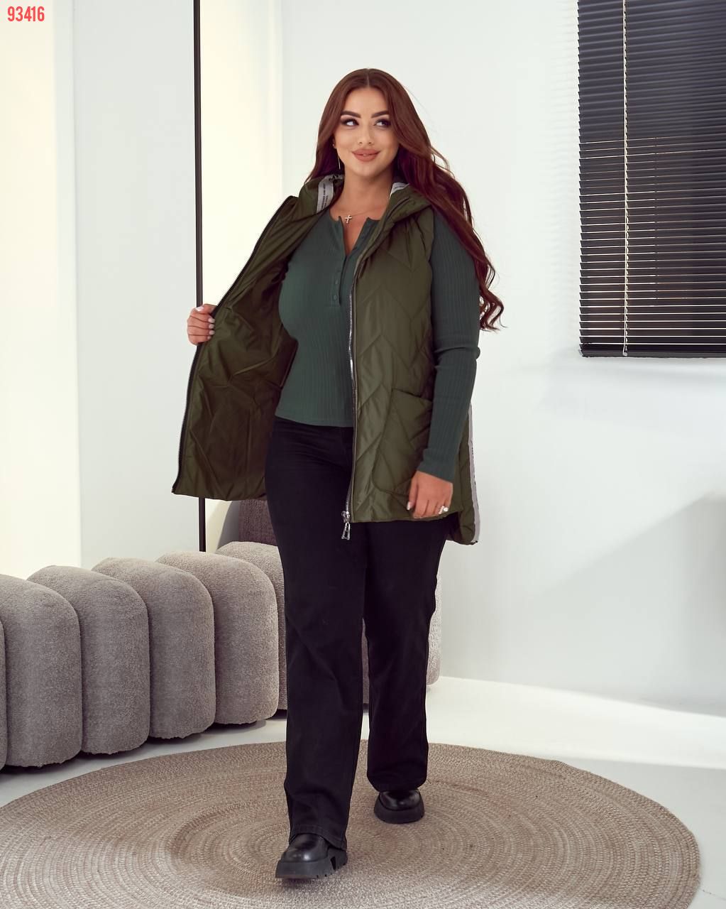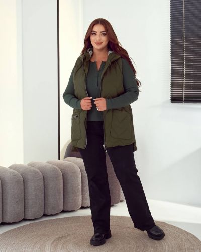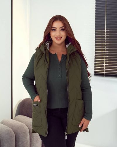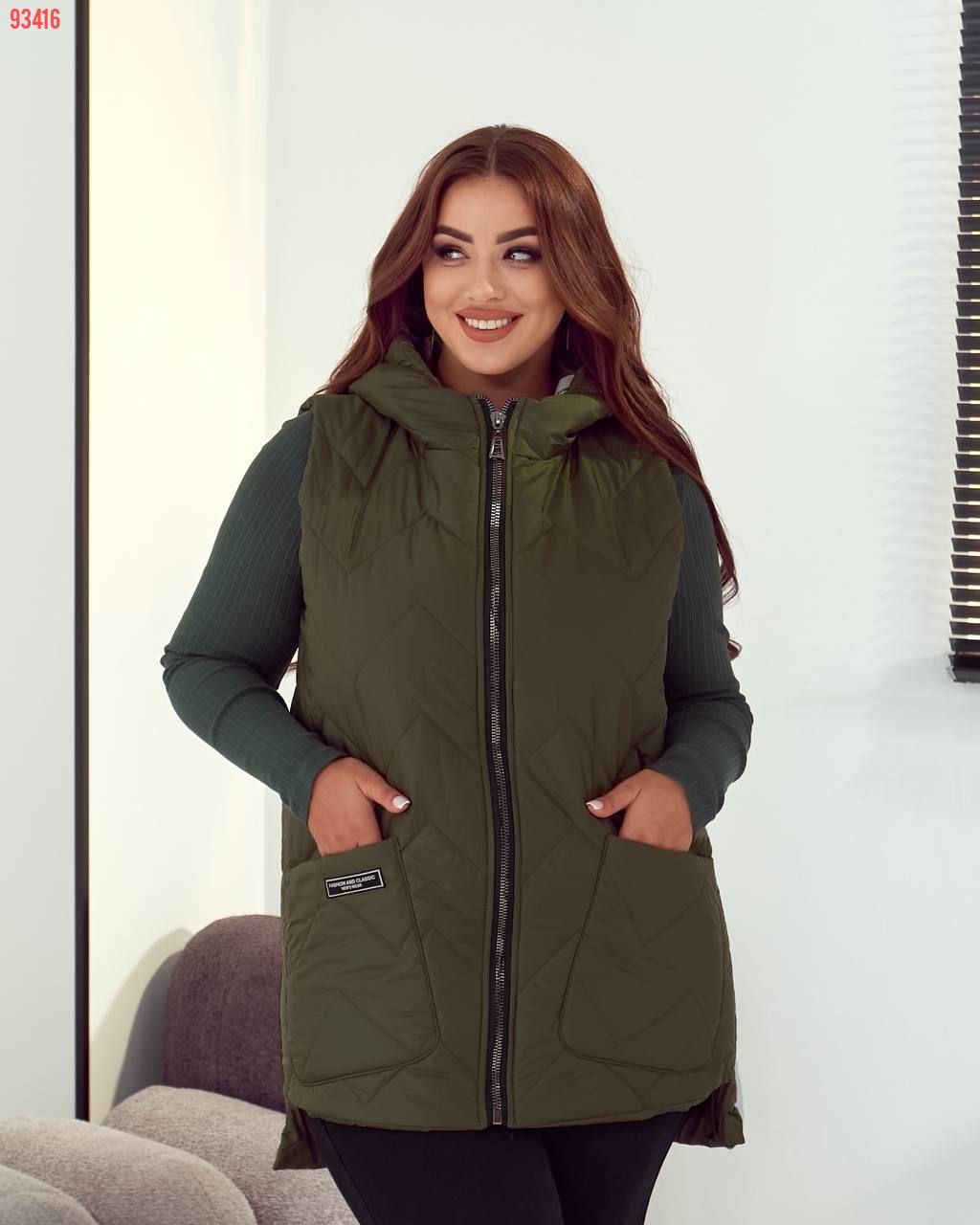 Стильна стегана жилетка прямого крою з накладними кишенями, зручний глибокий капюшон, декорована лампасами, якісна фурнітура.