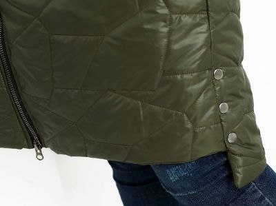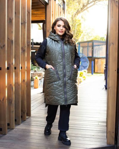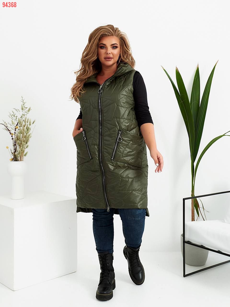 Стильна стегана жилетка прямого крою з накладними кишенями, зручний глибокий капюшон, якісна фурнітура, нашивка