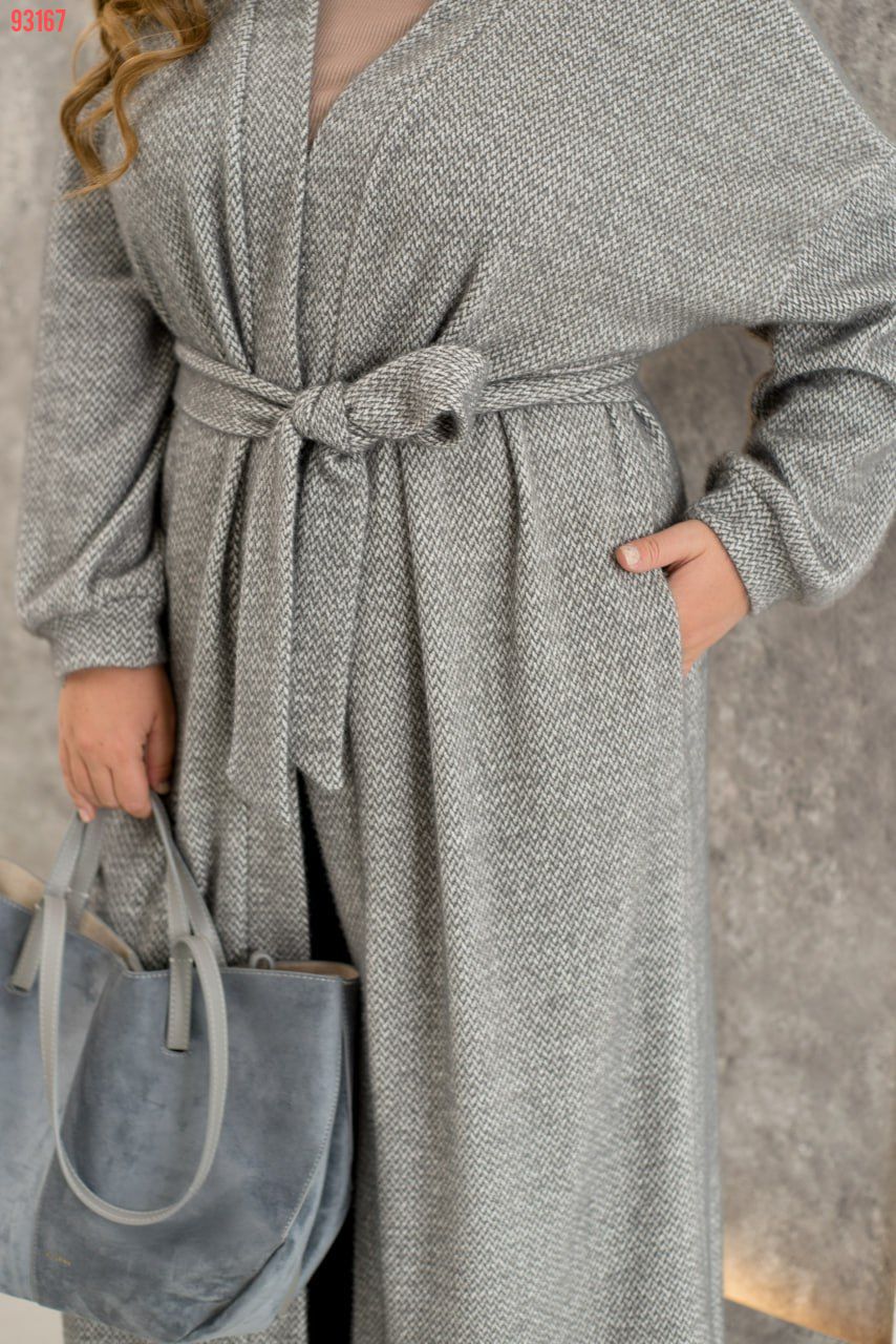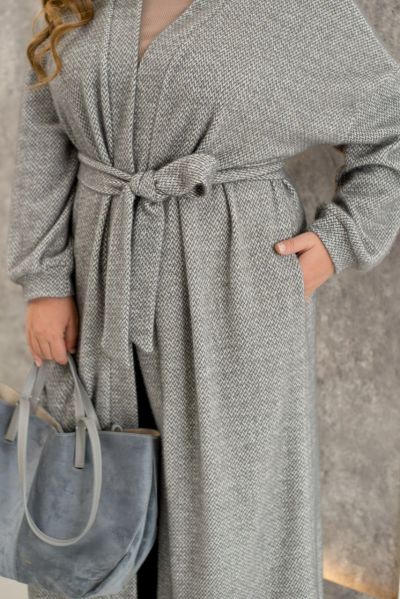 Довгий кардиган, створений із надзвичайно м’якої та приємної на дотик тканини, подарує вам комфорт і стиль у прохолодні дні. Зручні вшиті кишені з обох боків стануть практичним доповненням, а пояс у комплекті дозволяє легко підкреслити талію, створюючи елегантний силует. Цей кардиган чудово підійде для щоденних образів або розслаблених прогулянок, додаючи їм нотки тепла та витонченості. Текстильний пояс входить в комплект. На моделі представлений розмір 56-58