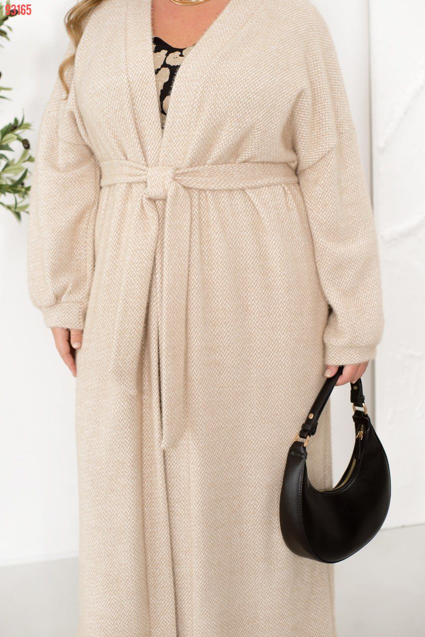 Довгий кардиган, створений із надзвичайно м’якої та приємної на дотик тканини, подарує вам комфорт і стиль у прохолодні дні. Зручні вшиті кишені з обох боків стануть практичним доповненням, а пояс у комплекті дозволяє легко підкреслити талію, створюючи елегантний силует. Цей кардиган чудово підійде для щоденних образів або розслаблених прогулянок, додаючи їм нотки тепла та витонченості.