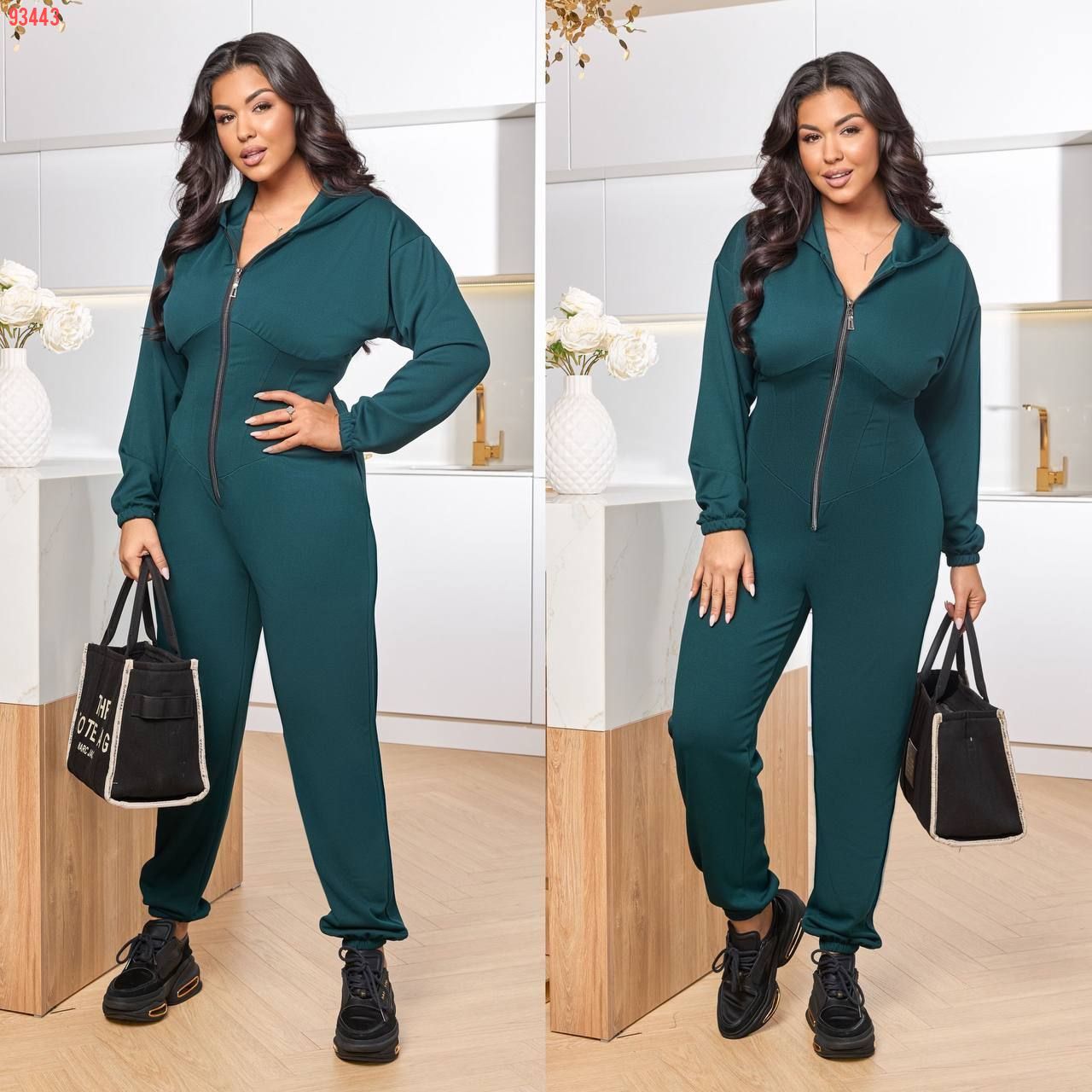 Стильний комбінезон , на блискавці , рукав та штани на резинці , з капюшоном , талія корсет .