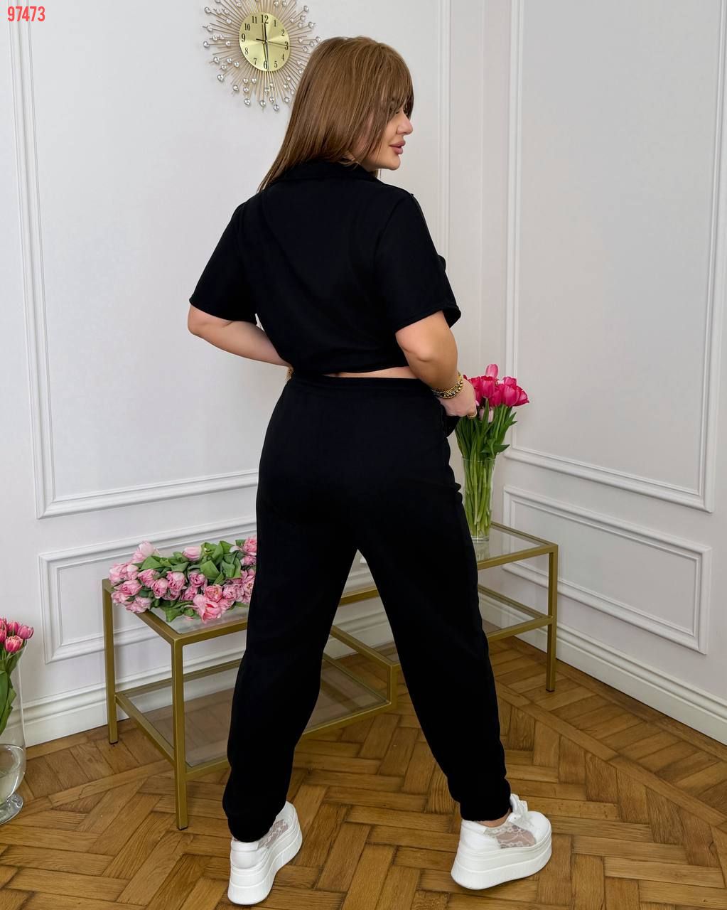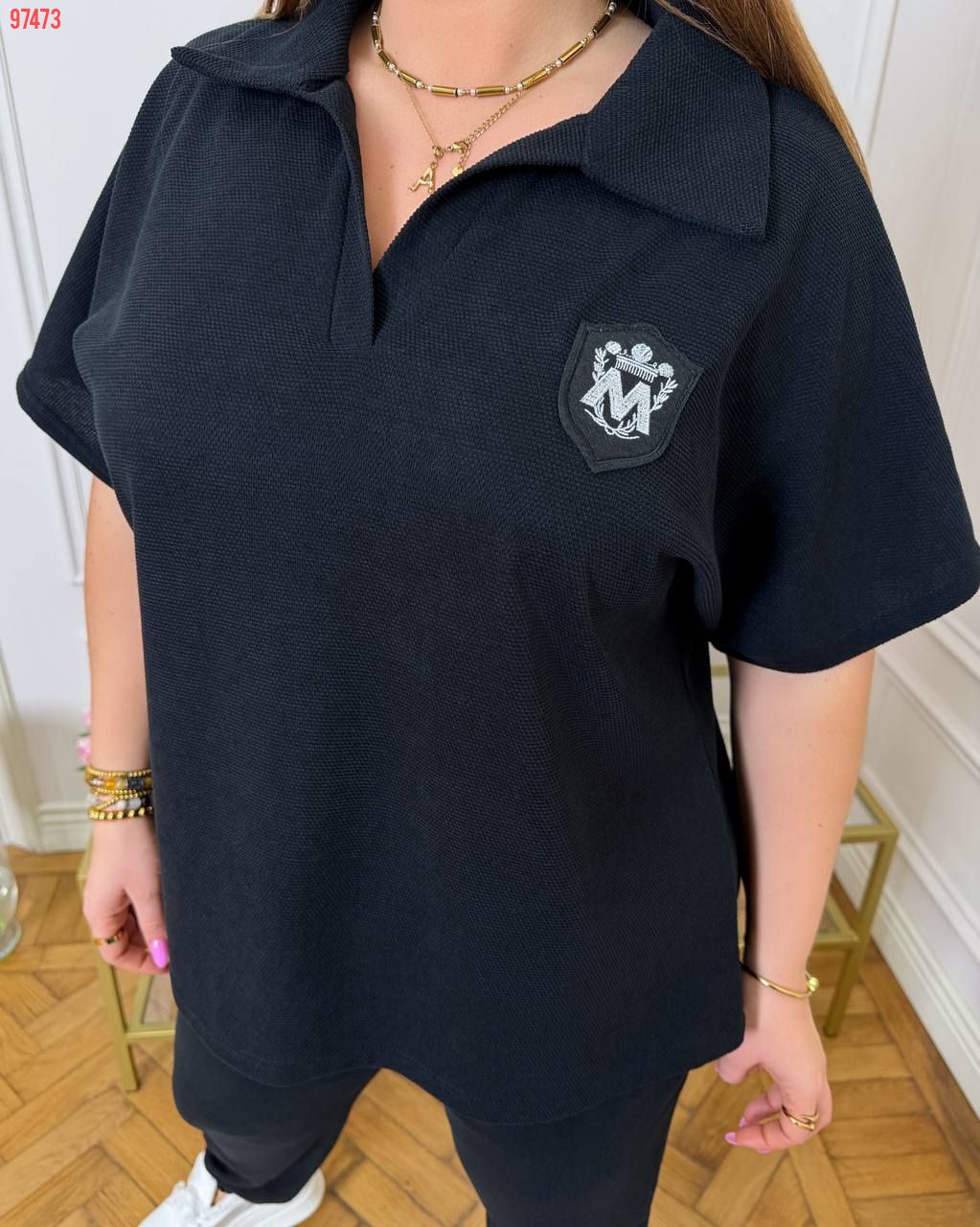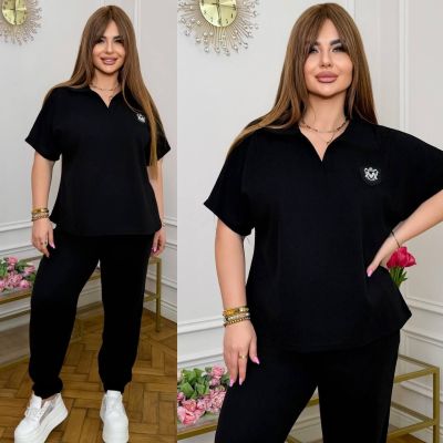 Тканина: трикотаж еластан: футболка поло у стилі оверсайз з Акс + штани з високою посадкою на еластичній гумці, з кишенями в бічних швах, низ штанів на гумці
