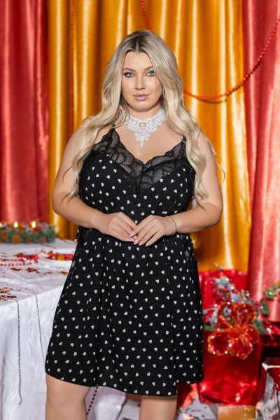Комплект складається з сорочки у поєднанні з халатиком. Ніжна нічна сорочка виконана в дизайні накидки - збоків без швів і на талії з боків має зав’язки для регулювання легкої приталенності. Тонкі бретелі з регулятором, регулюються на комфортну посадку . V- подібна горловина , спинка , бокові частини оформлені широким мереживом, створюючи елегантний акцент. Халат- на запах, або вільна посадка , на поясі. По бортах і рукавах оздоблені широким мереживом. Рукава довгі , розкльошені від ліктя додають силуету ніжності і витонченості.