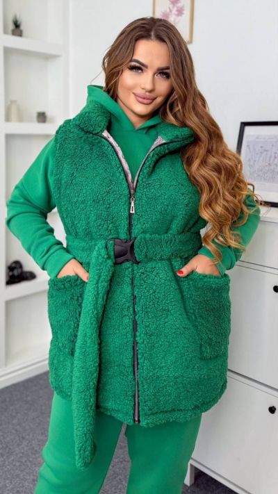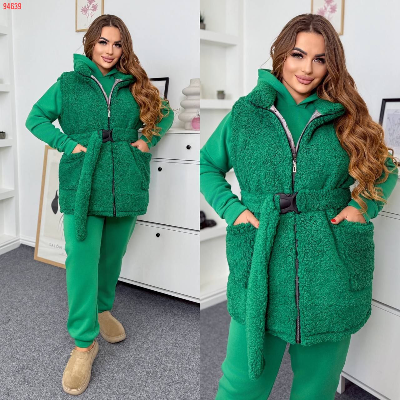 Осінній утеплений костюм трійка - жилет + худі + штани . Жилет на блискавці , комір стійка , з кишенями , пояс в комплекті . Худі на манжеті , з капюшоном . Штани з високою посадкою на гумці , з бічними кишенями , низ на манжеті .