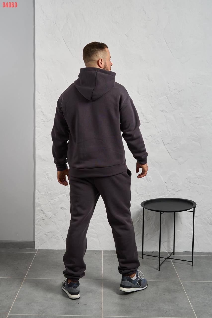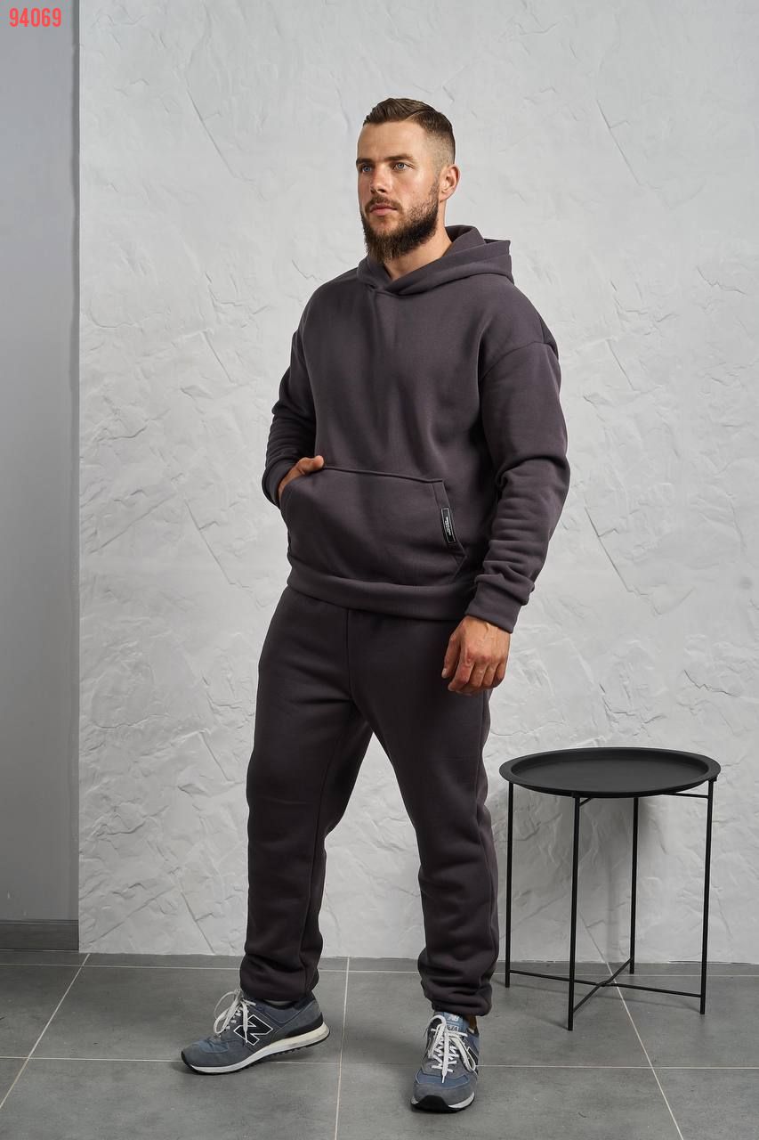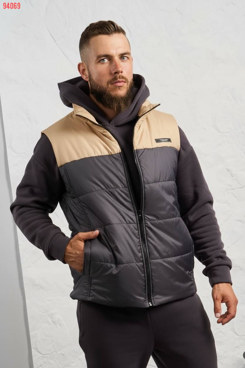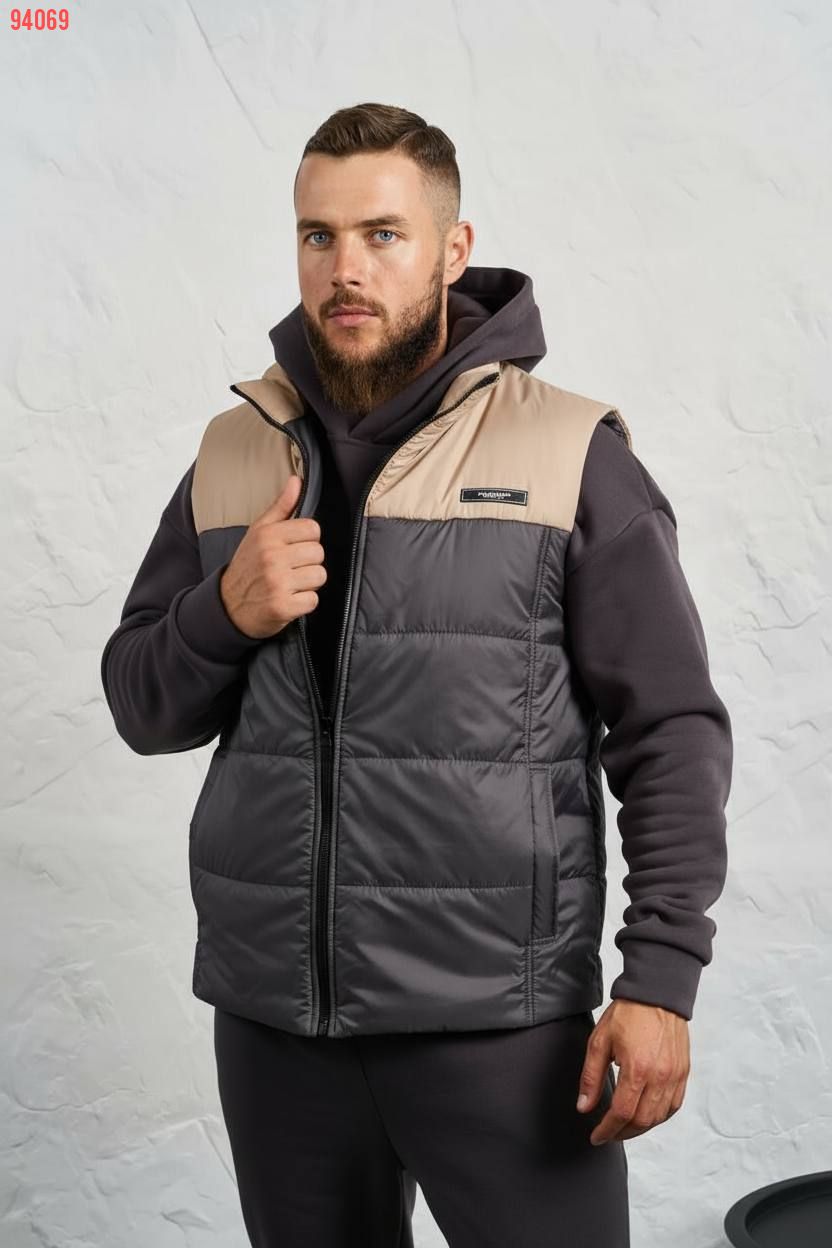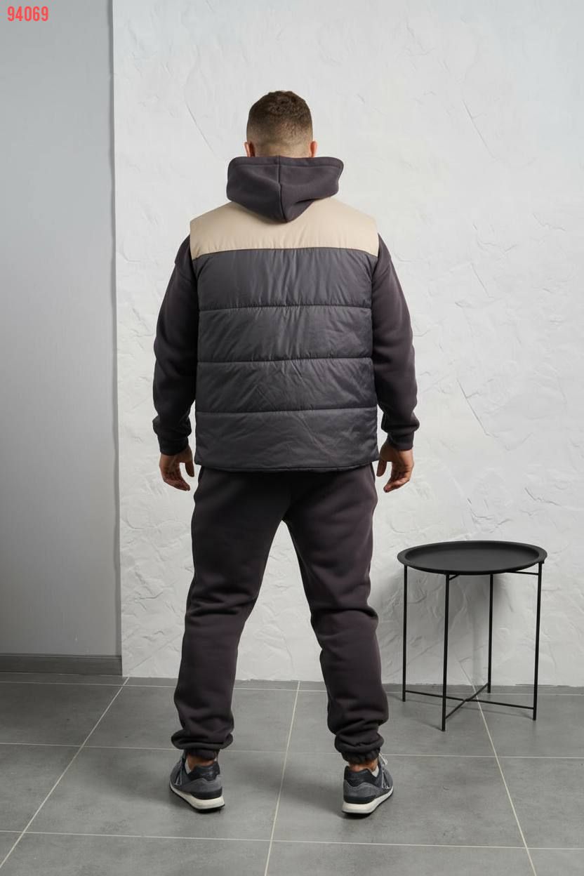 Стильний чоловічий комплект для прохолодної погоди. Складається з утепленого жилета та зручного бтеплого спортивного костюма, з кишенею кенгуру, збоку прикрашен нашивкою, з капюшоном. Рукава на манжетах. Штани прямі, висока посадка з кишенями, і знизу на гумці. Жилет стьобаний синтепоном, на підкладці з плащової тканини, застібається на блискавку, має дві бічні кишені, на грудях прикрашений нашивкою.