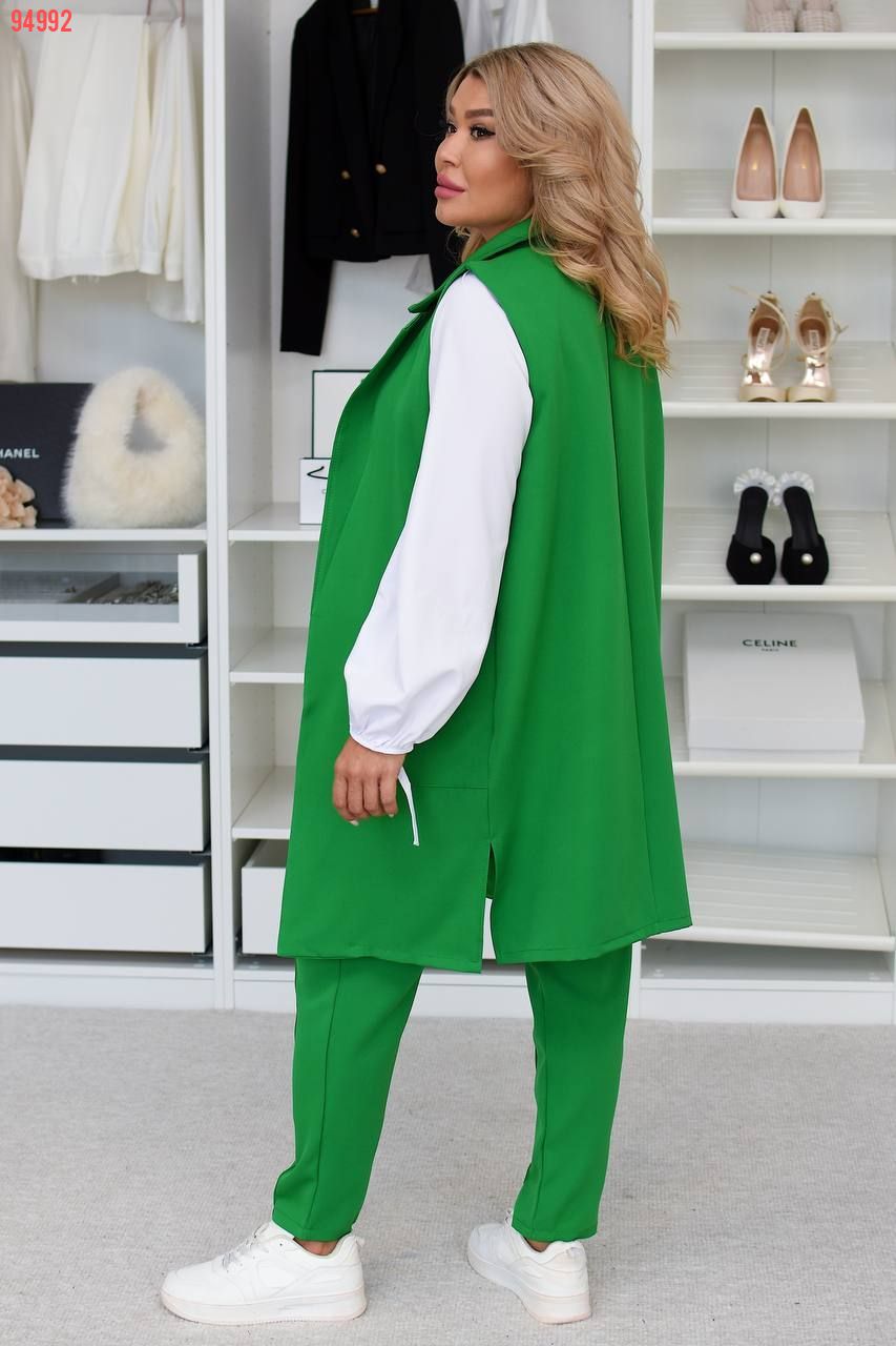 54-56 Довжина блузки: 64 см Довжина рукава: 69 см ОГ: 120 см Довжина брюк: 92 см ОС: 120 см ОТ: гумка - 114 см Довжина жилетки: 90 см ОГ: 116 см ОТ: 116 см ОС: 116 см