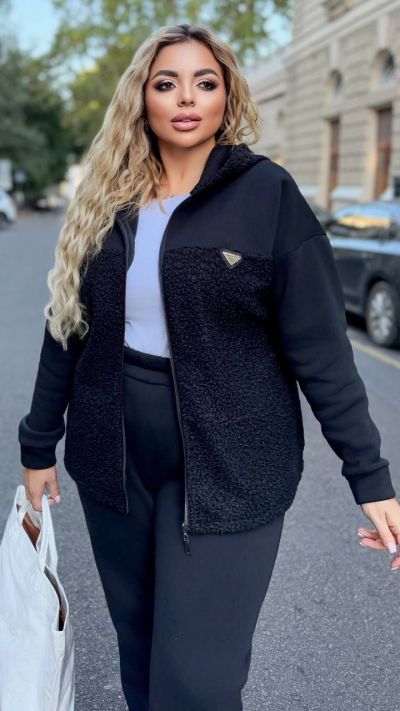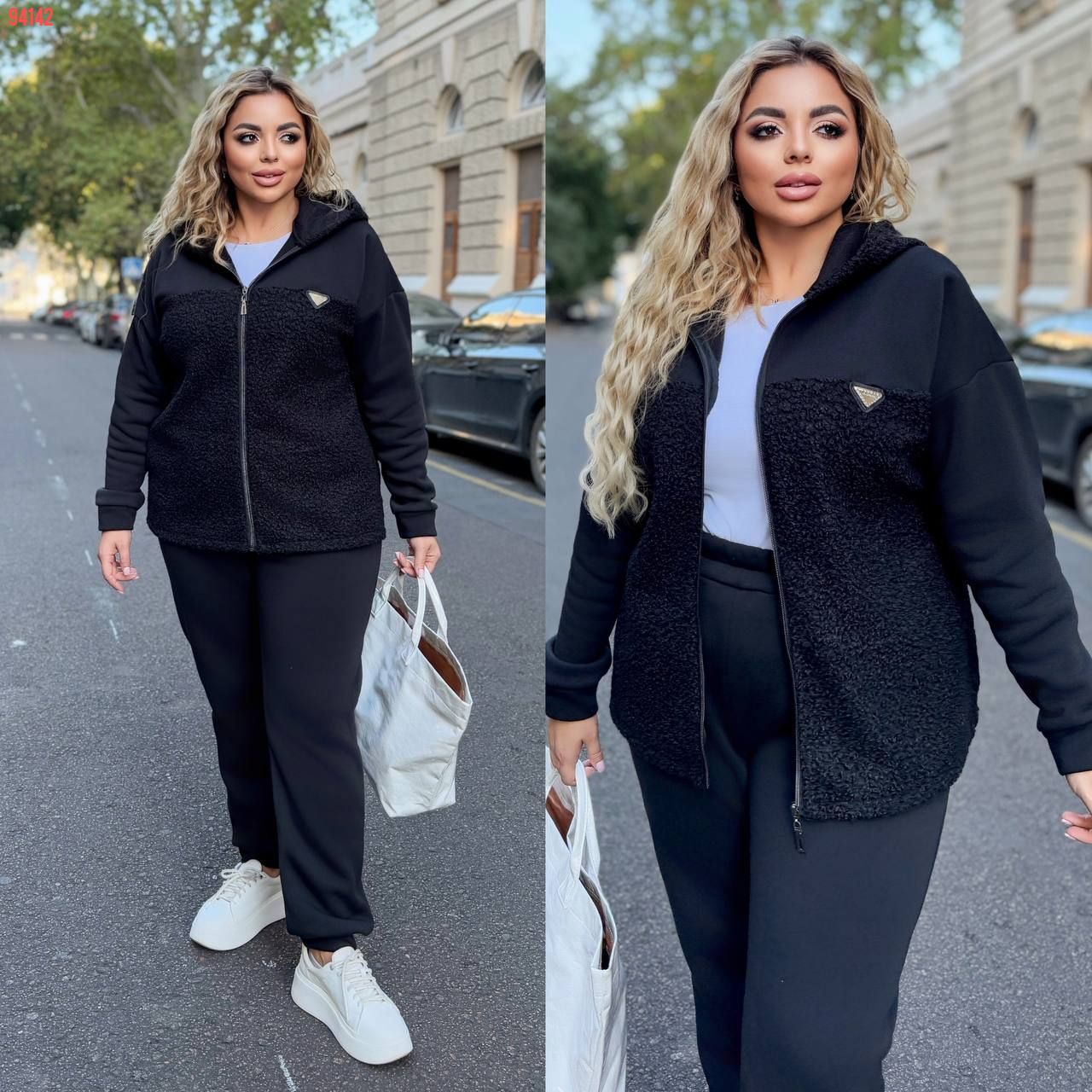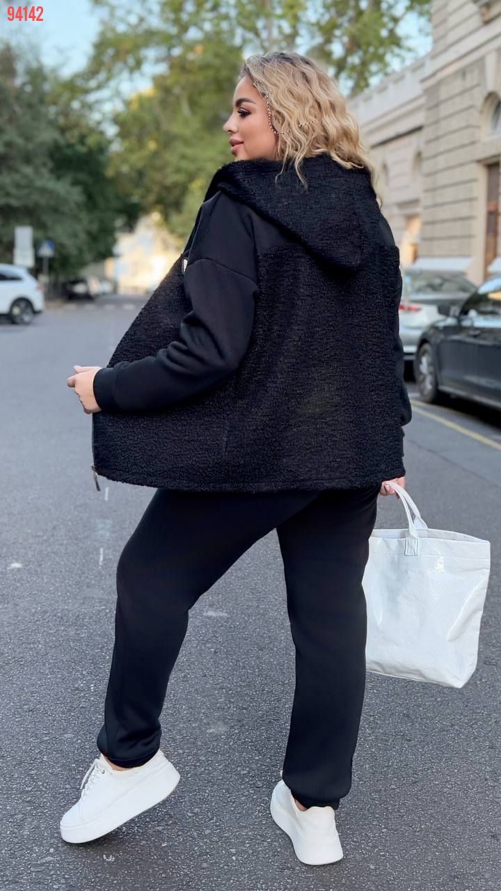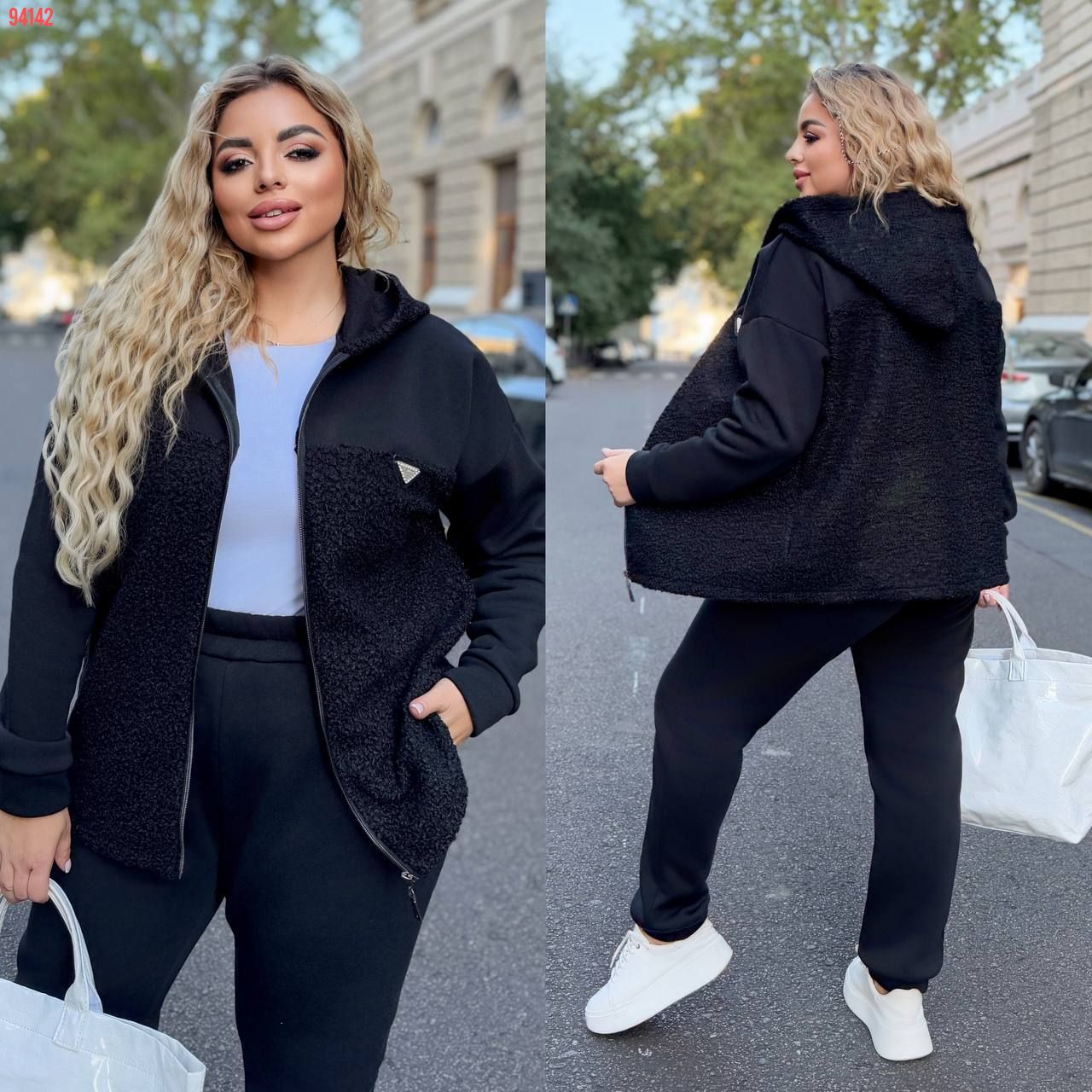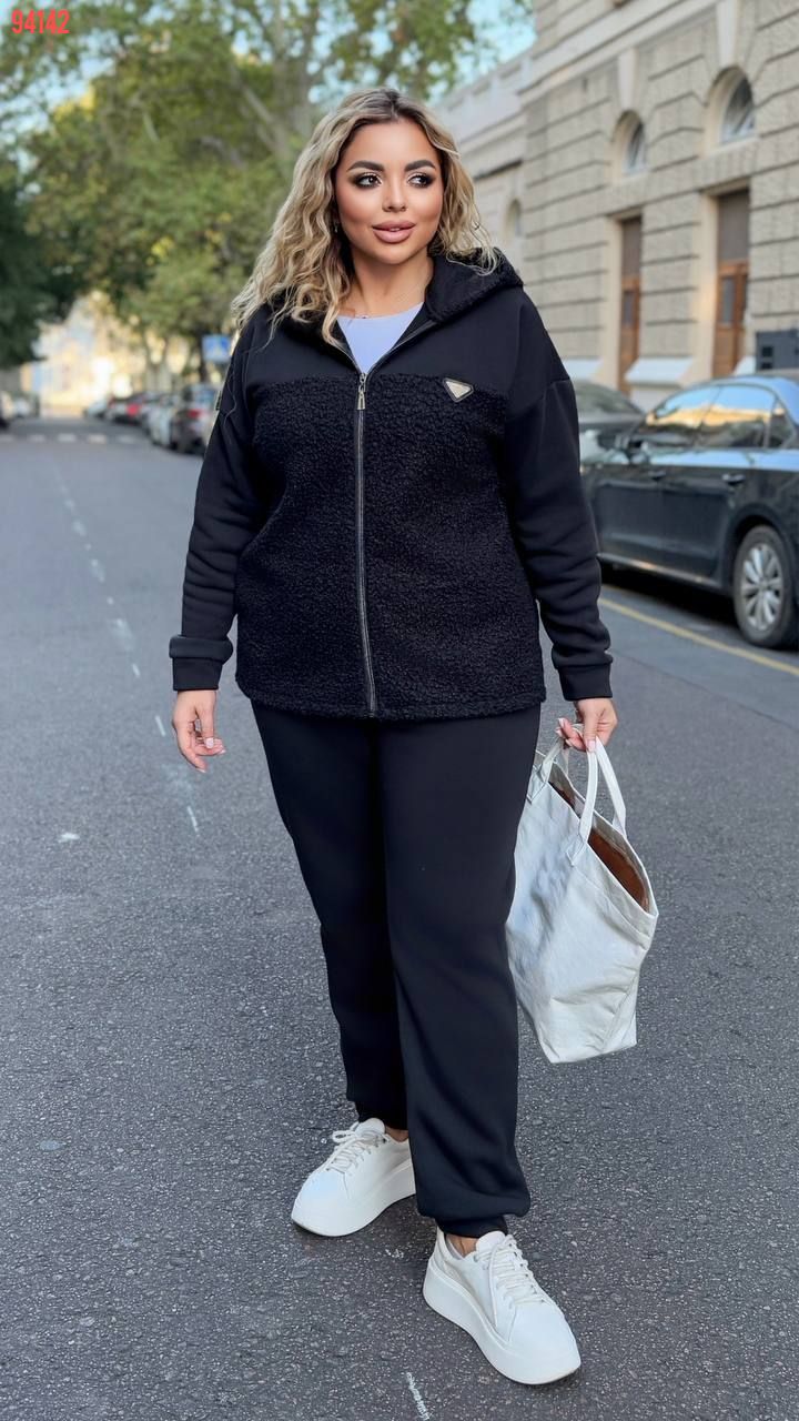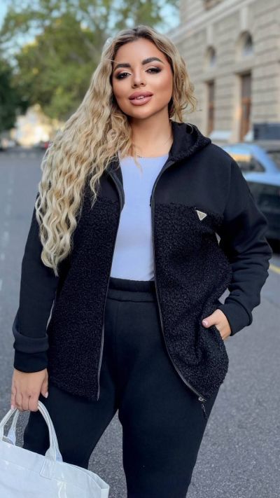 Теплий костюм на холодну пору . Комбінований худі на блискавці , з капюшоном . Штани з високою посадкою , пояс на гумці , бічні кишені .