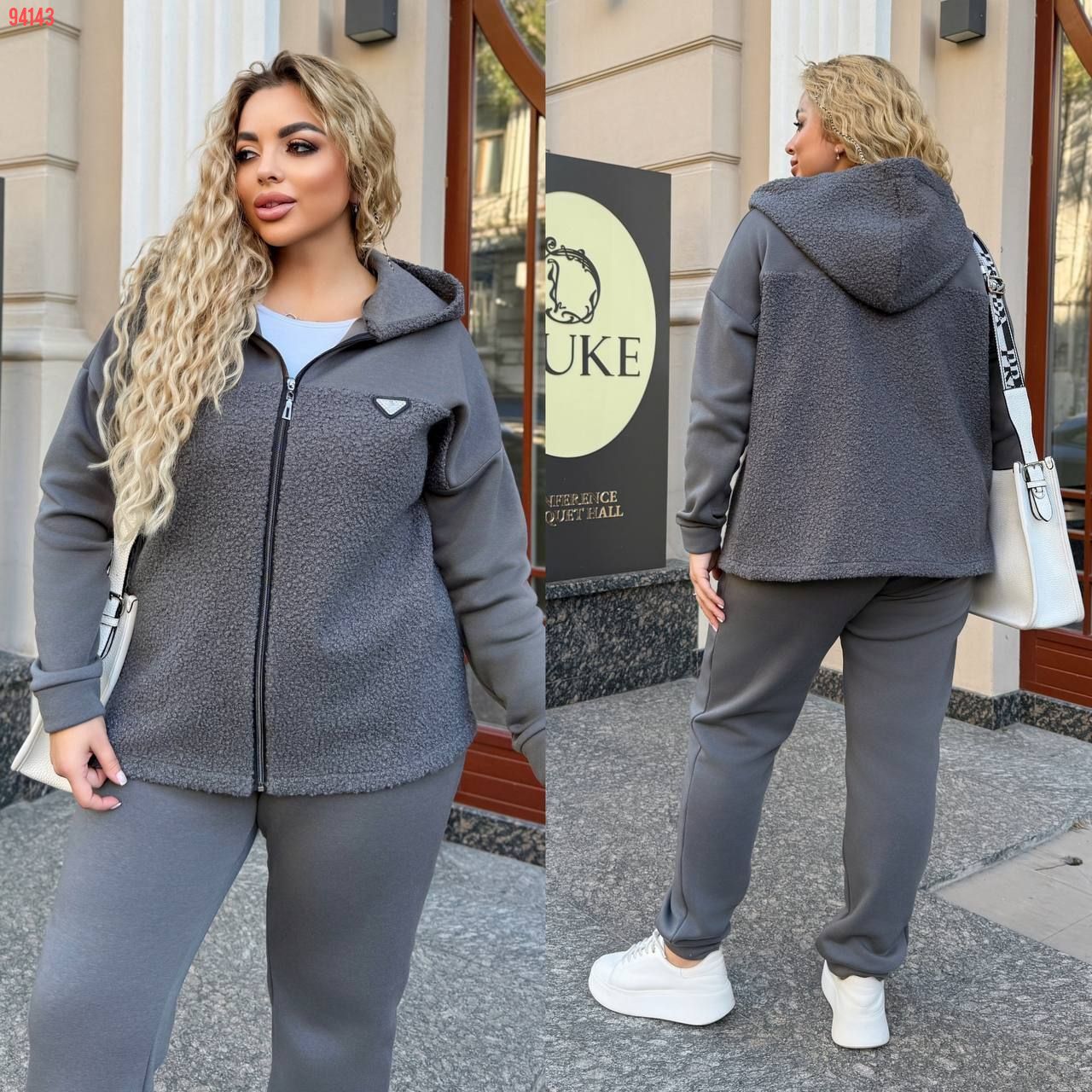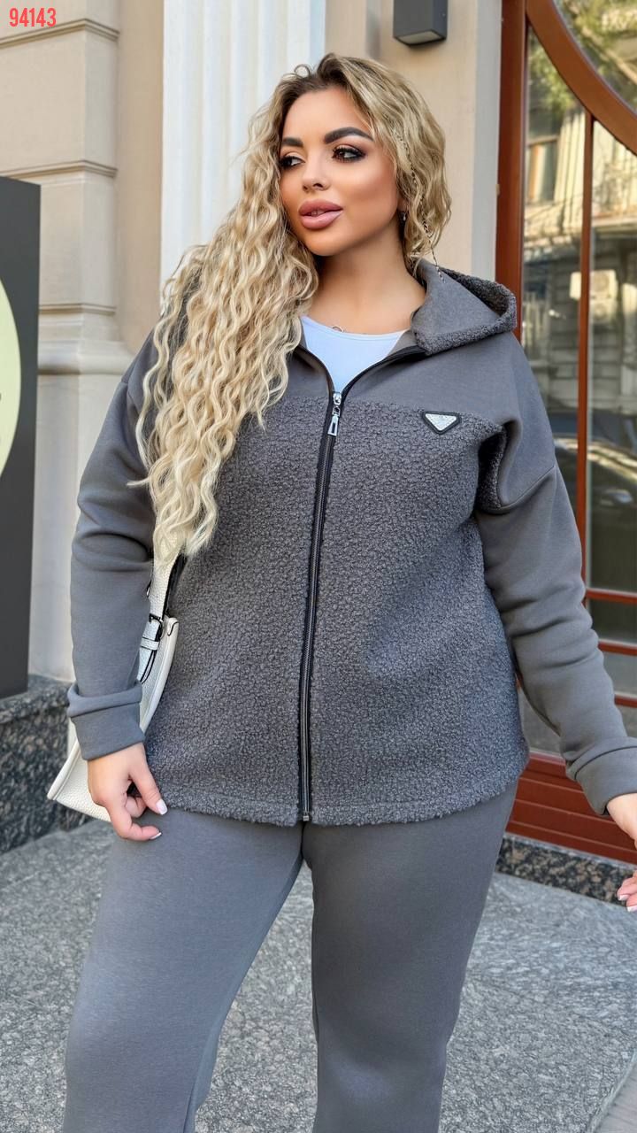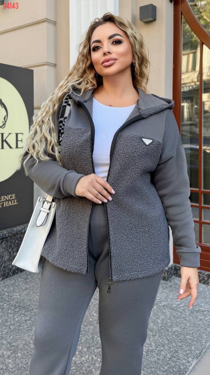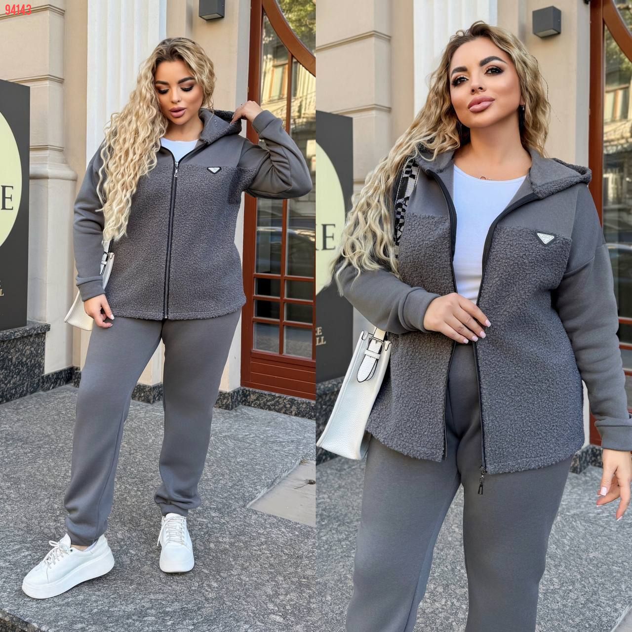 Теплий костюм на холодну пору . Комбінований худі на блискавці , з капюшоном . Штани з високою посадкою , пояс на гумці , бічні кишені .