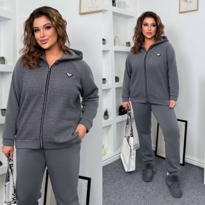 Теплий костюм на холодну пору . Комбінований бомбер на блискавці , з капюшоном . Штани з високою посадкою , пояс на гумці , бічні кишені .