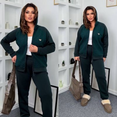 Теплий костюм на холодну пору . Комбінований бомбер на блискавці , з капюшоном . Штани з високою посадкою , пояс на гумці , бічні кишені .