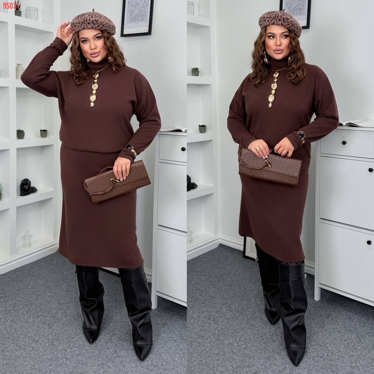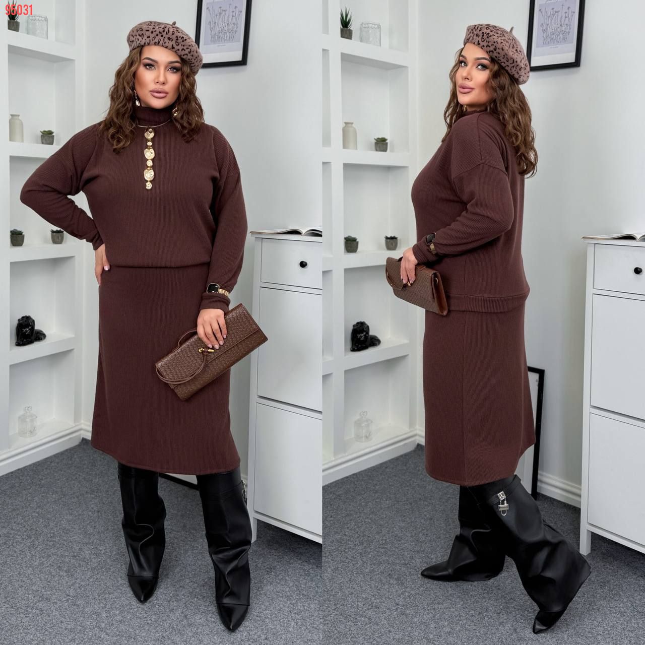 Теплий костюм - кофта + спідниця . Кофта прямого покрою , комір стійка , на манжеті . Спідниця покрою трапеція , пояс на гумці .