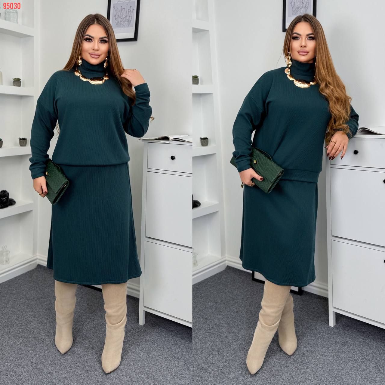 Теплий костюм - кофта + спідниця . Кофта прямого покрою , комір стійка , на манжеті . Спідниця покрою трапеція , пояс на гумці .
