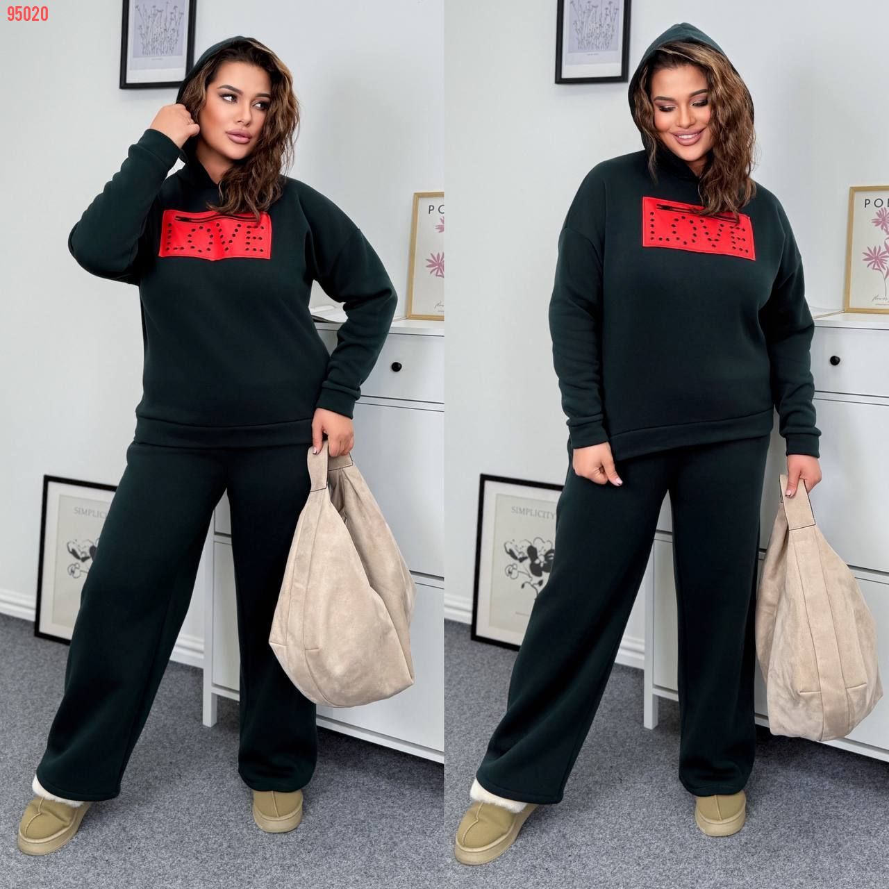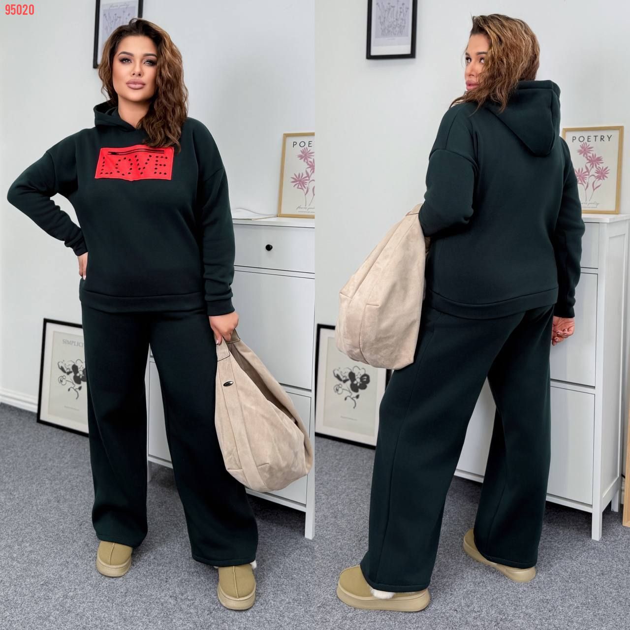 Теплий костюм на холодну пору . Світшот на манжеті , з капюшоном . Широкі штани з високою посадкою , пояс на гумці , бічні кишені .
