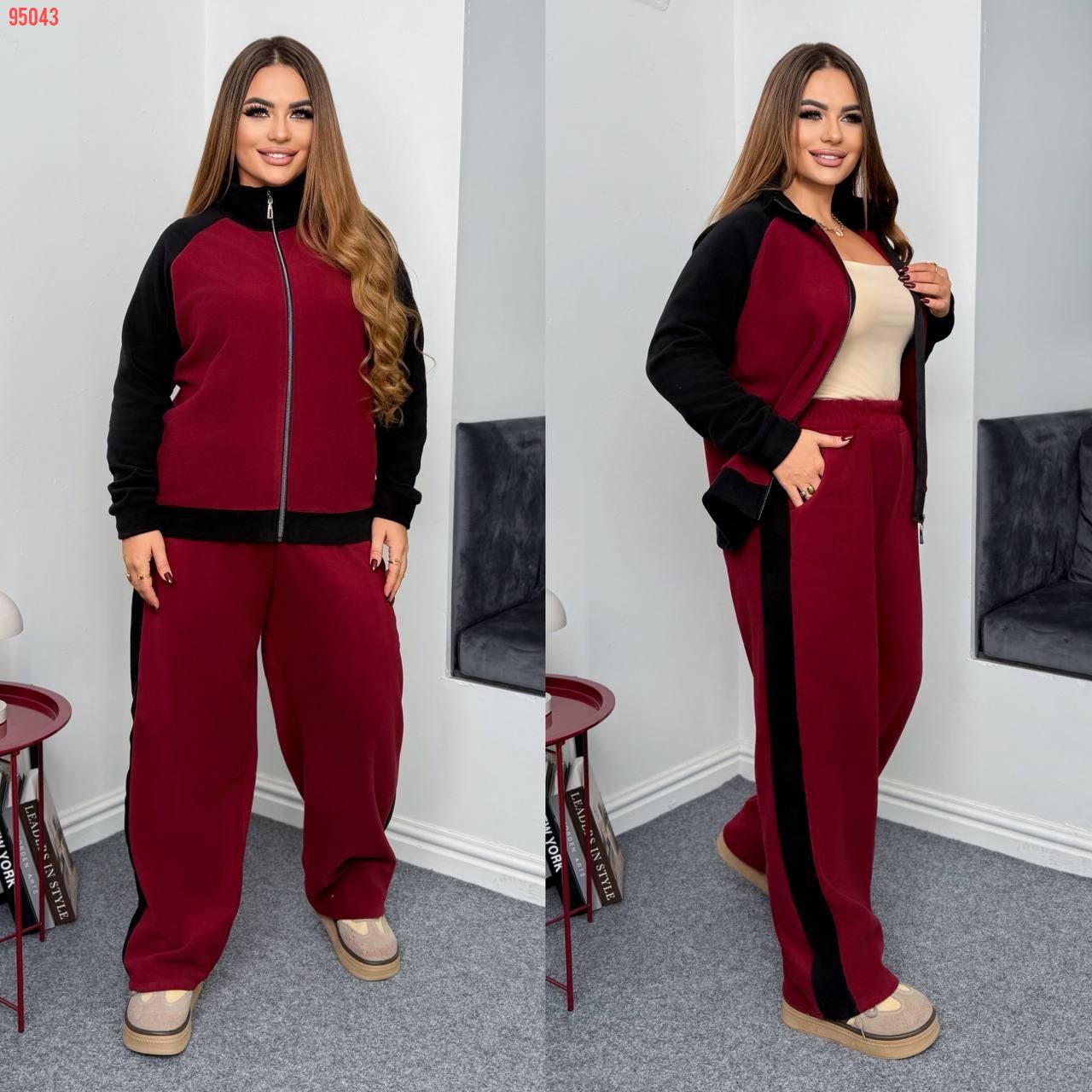 Теплий костюм на холодну пору . Комбінований бомбер на блискавці , з стійкою . Штани з високою посадкою , пояс на гумці , з ломпасом , бічні кишені .