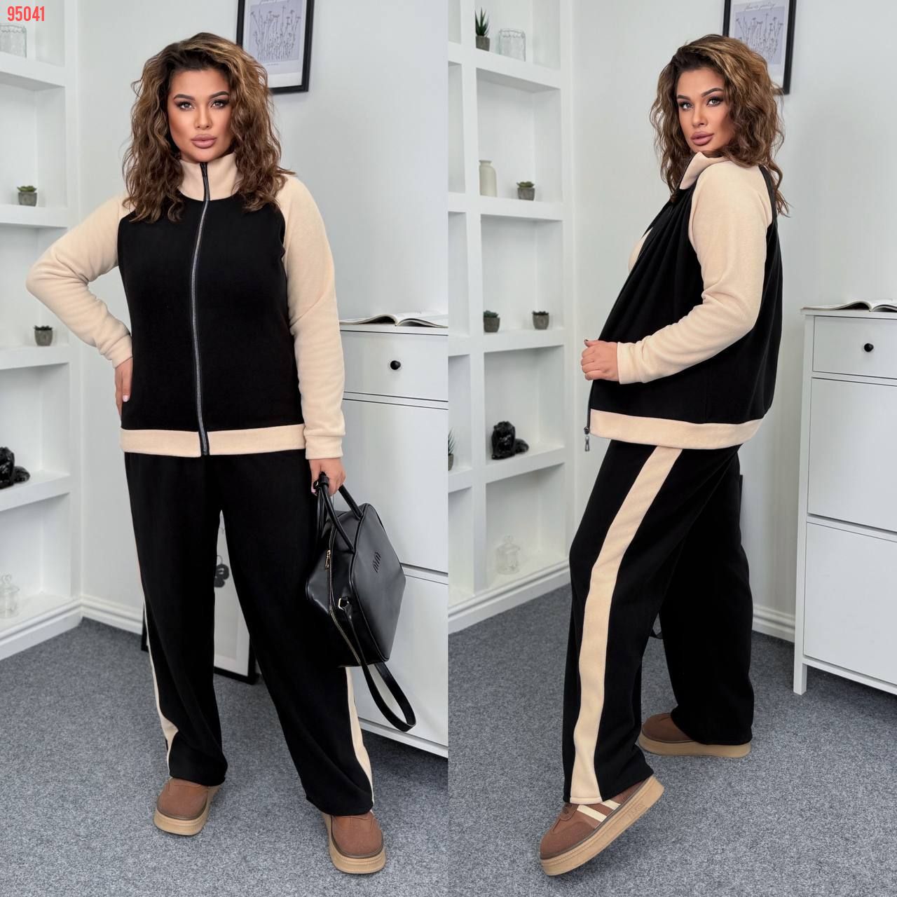 Теплий костюм на холодну пору . Комбінований бомбер на блискавці , з стійкою . Штани з високою посадкою , пояс на гумці , з ломпасом , бічні кишені .