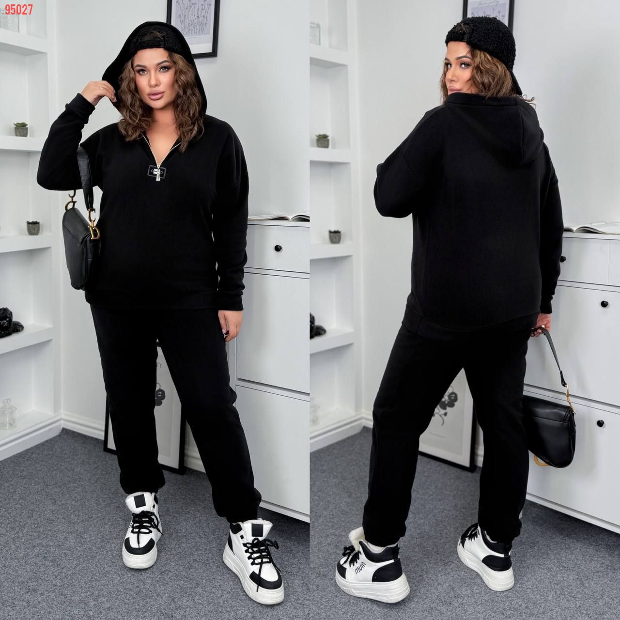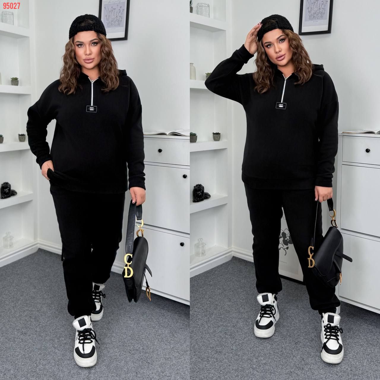 Теплий костюм на холодну пору . Стильний світшот зверху на блискавці , з капюшоном . Штани з високою посадкою , пояс на гумці , бічні кишені .