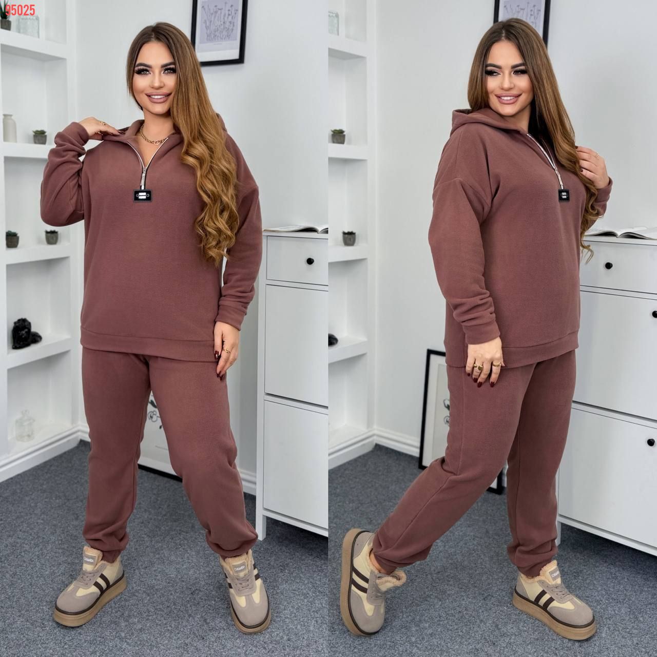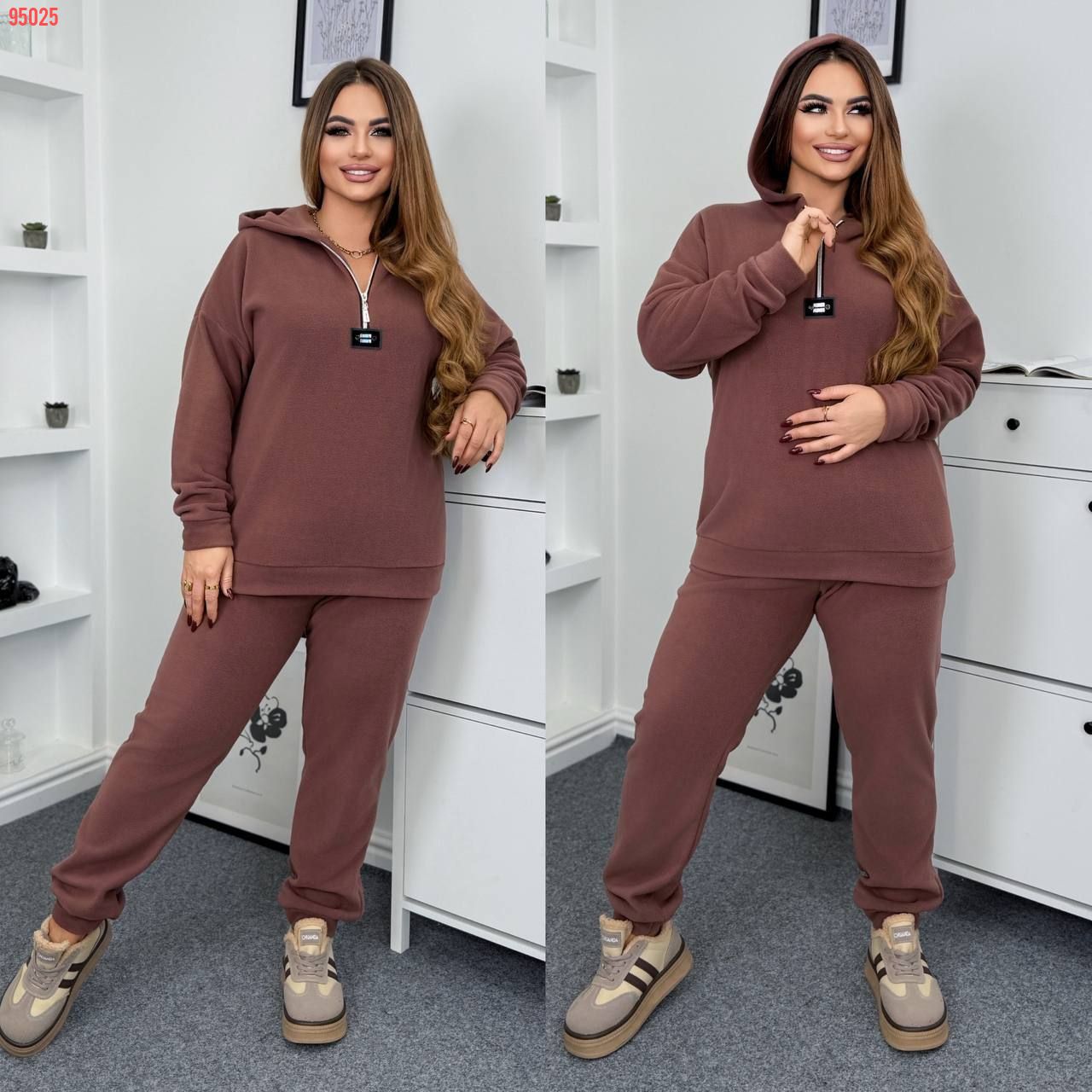 Теплий костюм на холодну пору . Стильний світшот зверху на блискавці , з капюшоном . Штани з високою посадкою , пояс на гумці , бічні кишені .