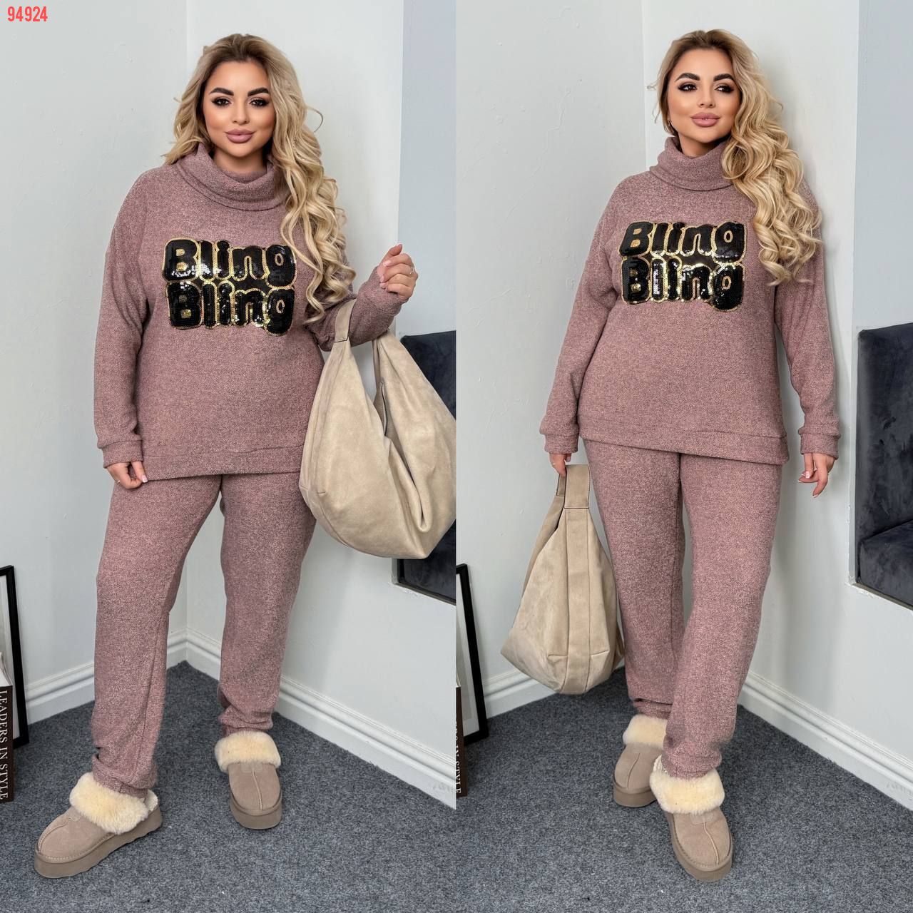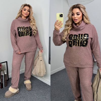 Довжина штанів : 106 см. Теплий костюм двійка . Кофта з обʼємним коміром , на манжеті . Штани з високою посадкою , пояс на гумці .