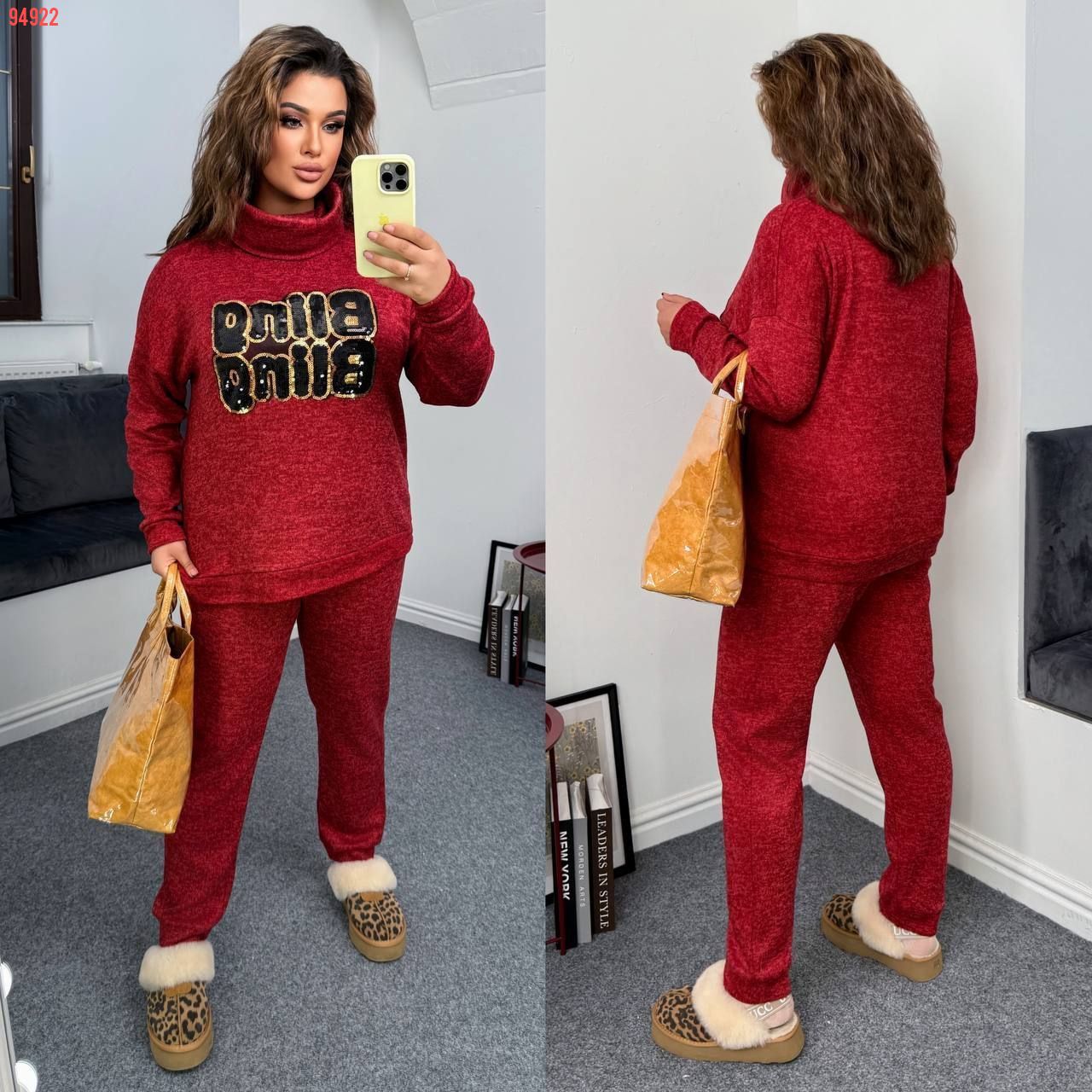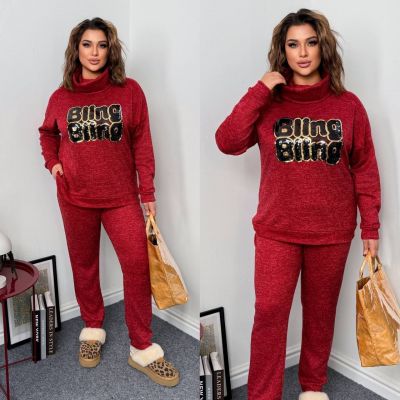 Довжина штанів : 106 см. Теплий костюм двійка . Кофта з обʼємним коміром , на манжеті . Штани з високою посадкою , пояс на гумці .
