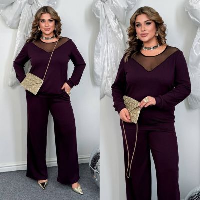 Довжина штанів : 110 см. Святковий костюм двійка . Штани з високою посадкою , пояс на гумці . Кофта прямого покрою на манжеті , з V - подібною вставкою з сітки .