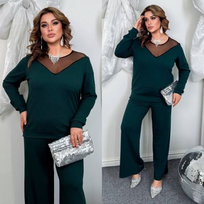 Довжина штанів : 110 см. Святковий костюм двійка . Штани з високою посадкою , пояс на гумці . Кофта прямого покрою на манжеті , з V - подібною вставкою з сітки .