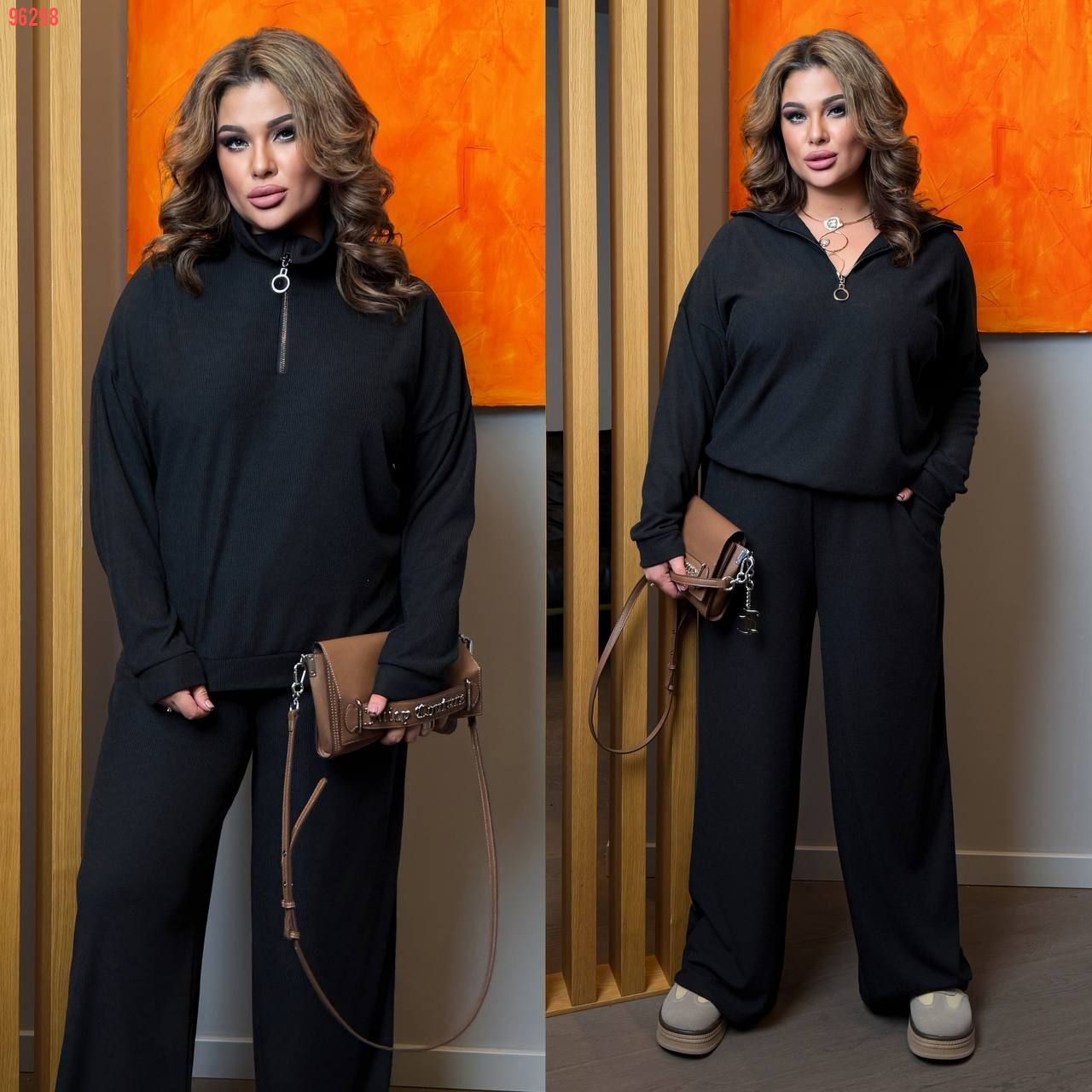 Довжина штанів : 110 см. Стильний костюм двійка . Штани з високою посадкою , пояс на гумці . Кофта прямого покрою на манжеті , комір на блискавці .