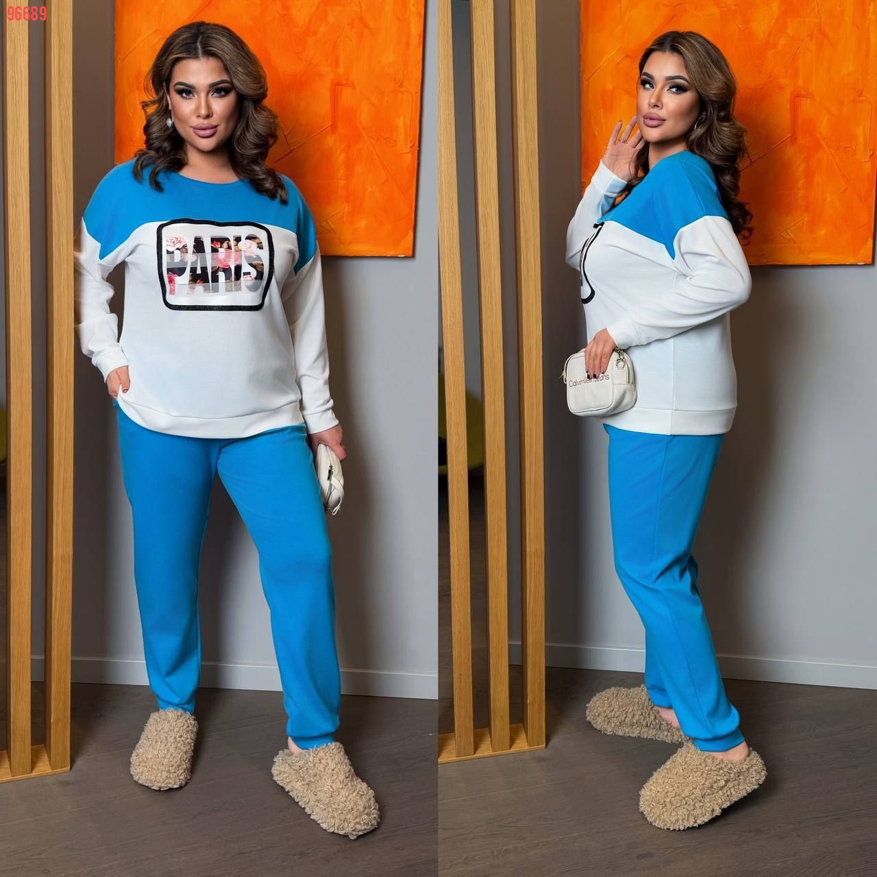 Довжина штанів : 106 см. . Штани з високою посадкою , пояс на гумці . Кофта прямого покрою з нашивкою .
