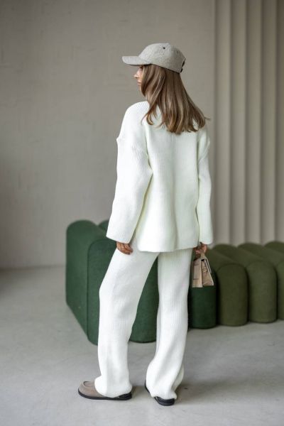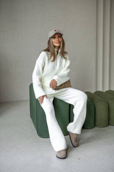 Затишний костюм із м'якої щільної пряжі з ідеальною посадкою. Вільний светр на блискавці та прямі штани створюють стильний та розслаблений силует. Підходить для міста, подорожей та відпочинку.