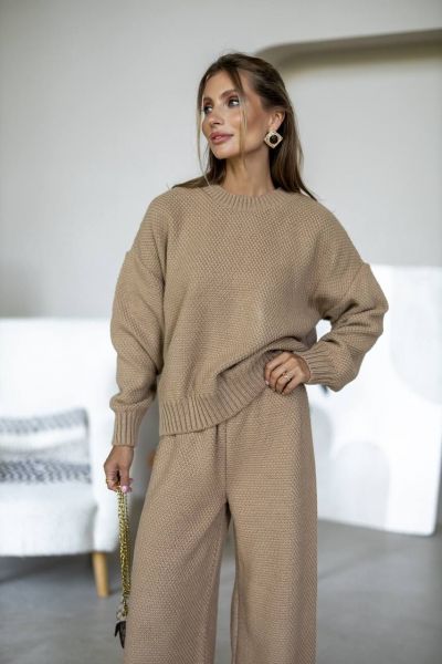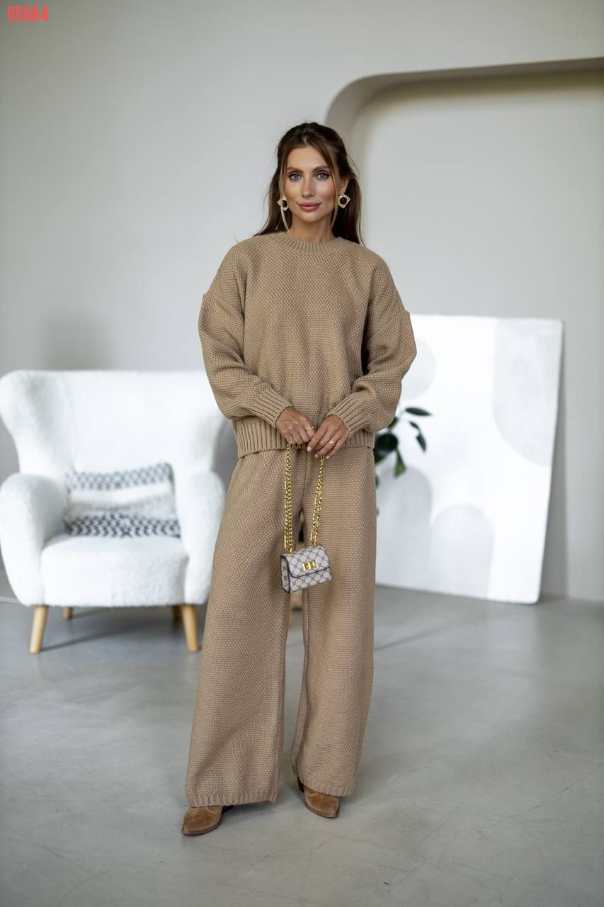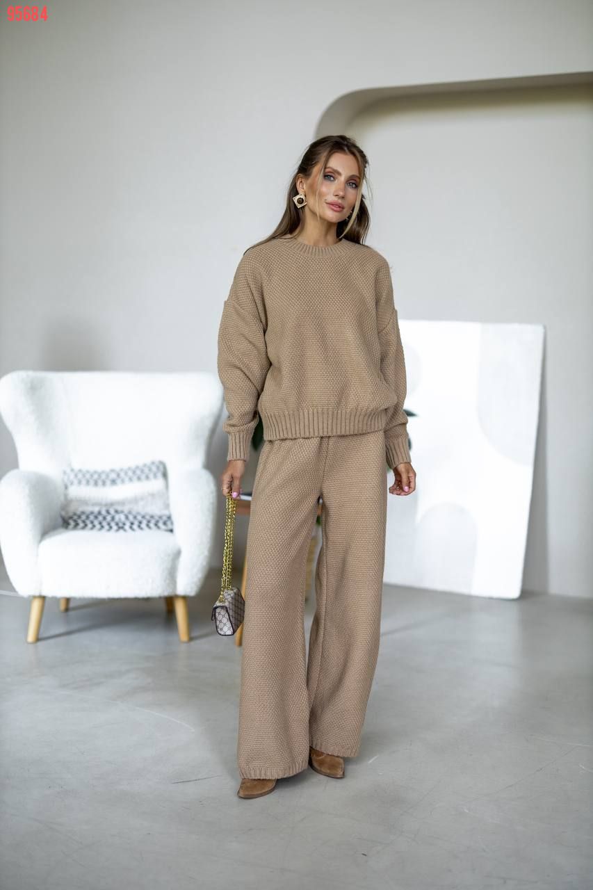 Затишний костюм із щільної фактурної в'язки з м'яким приляганням до тіла. Вільний светр та прямі штани створюють елегантний, розслаблений образ щодня.