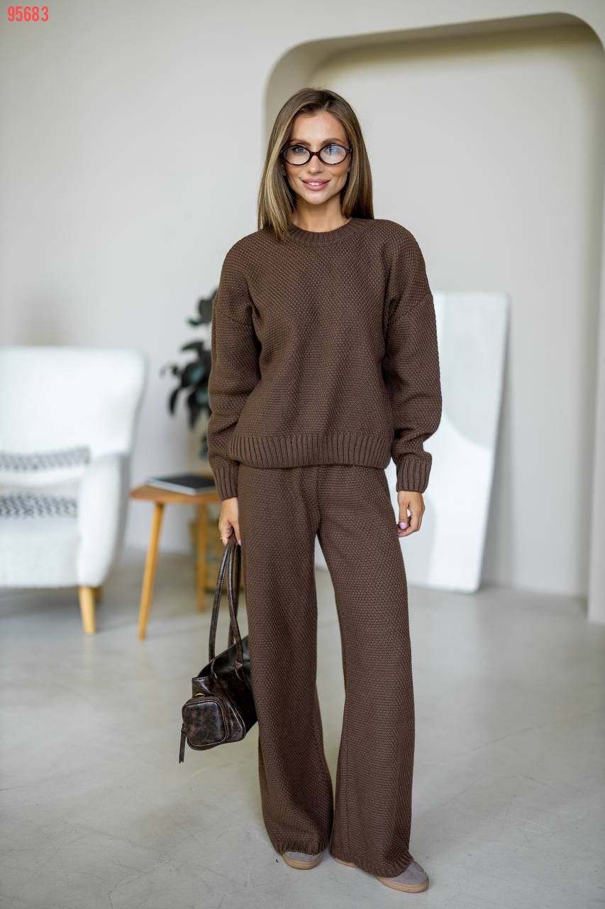 Затишний костюм із щільної фактурної в'язки з м'яким приляганням до тіла. Вільний светр та прямі штани створюють елегантний, розслаблений образ щодня.