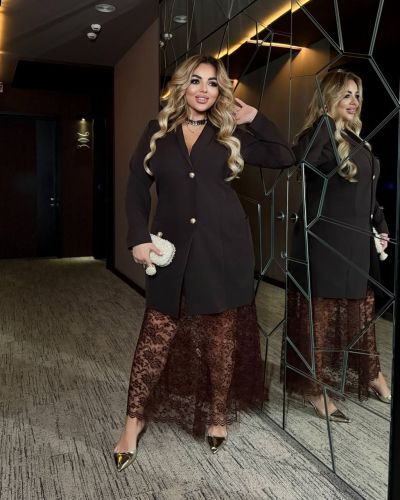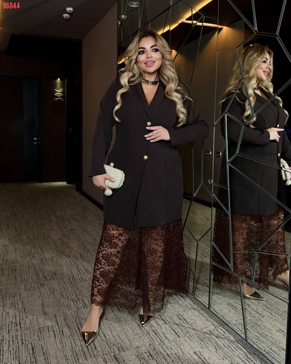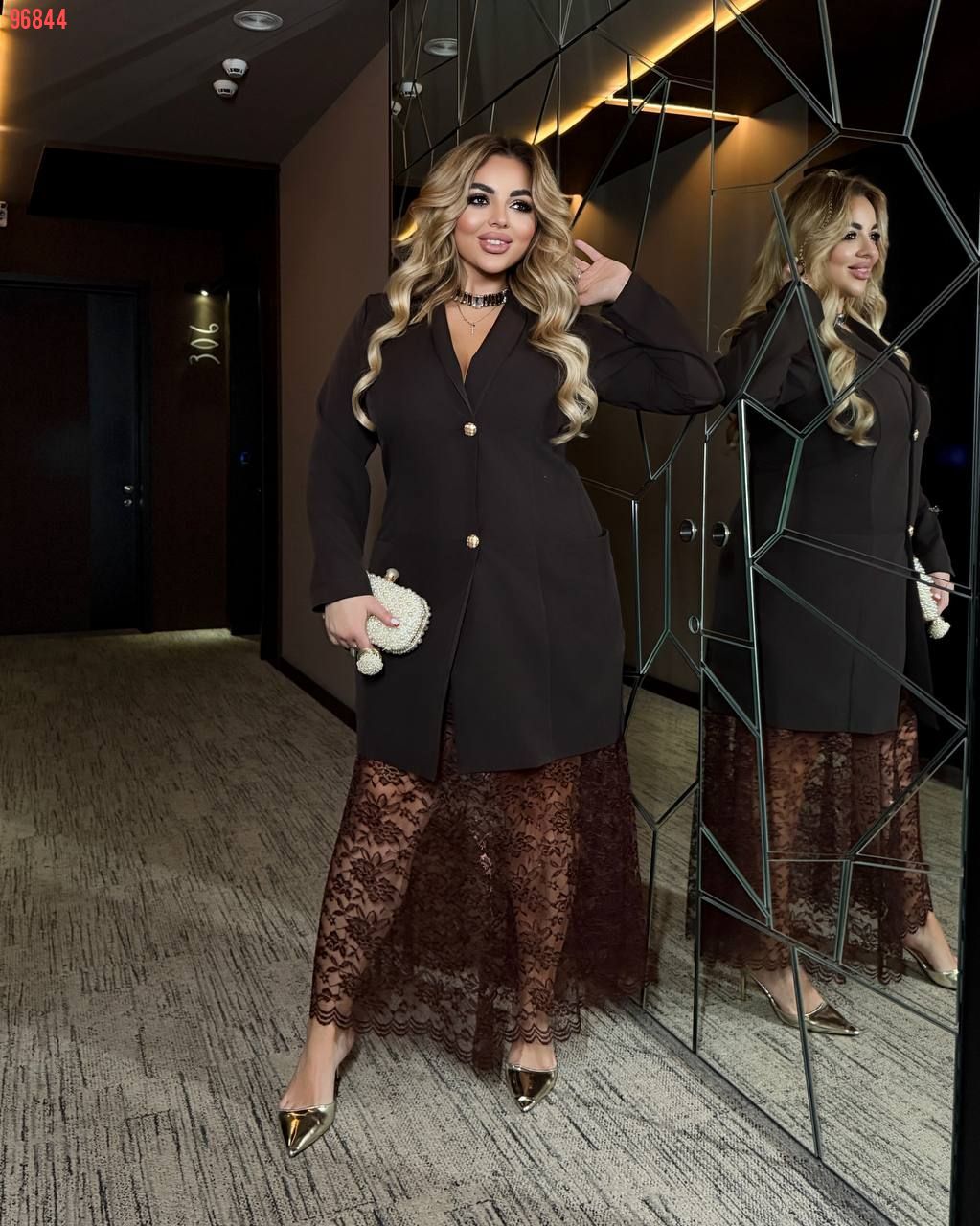Нарядний костюм-двійка : жакет застібається на золоті ґудзики, комір-стійка , з боків великі кишені , довгий рукав; спідниця на резинці на трикотажній підкладці.
