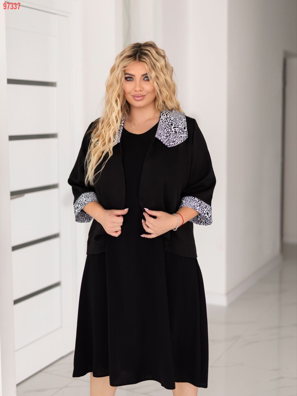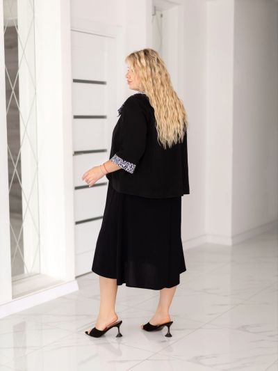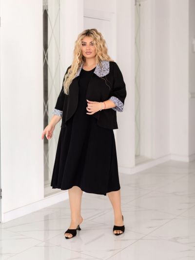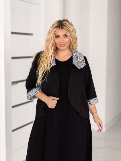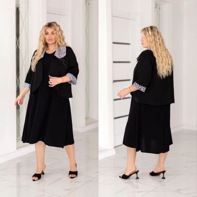 Додаткові характеристики: чудовий костюм двійка . Сукня вільного крою яка вигідно підкреслює жіночу фігуру.Це не лише красиво, в й дуже зручно, сукня не сковує руху,надаючи повну свободу . Піджак прикрашений з гарним принтованим коміром та манжетом. по рукаві . В ньому можно піти на вечірку, або навіть на ділову зустріч.