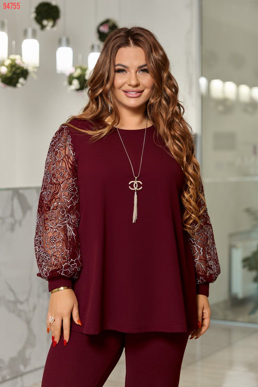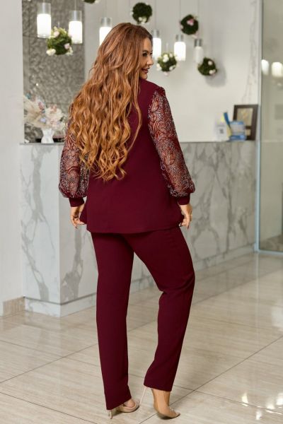 Неймовірно жіночний образ. Костюм складається з блузи та штанів. Блуза по спинці застібається на гудзик. Окрасою служать широкі рукави, виконані з сітки із сріблястим напиленням, що створює делікатне мерехтіння.