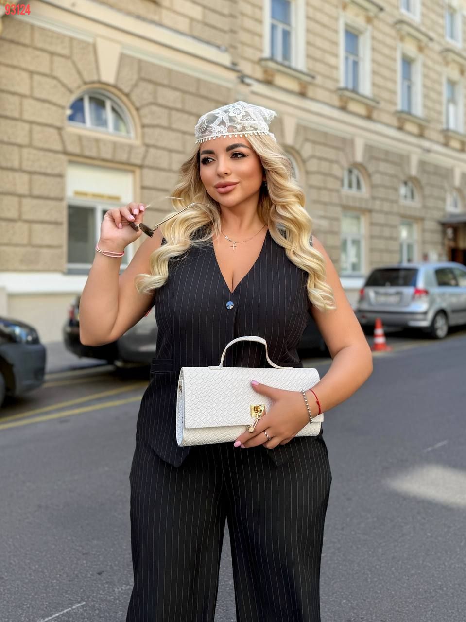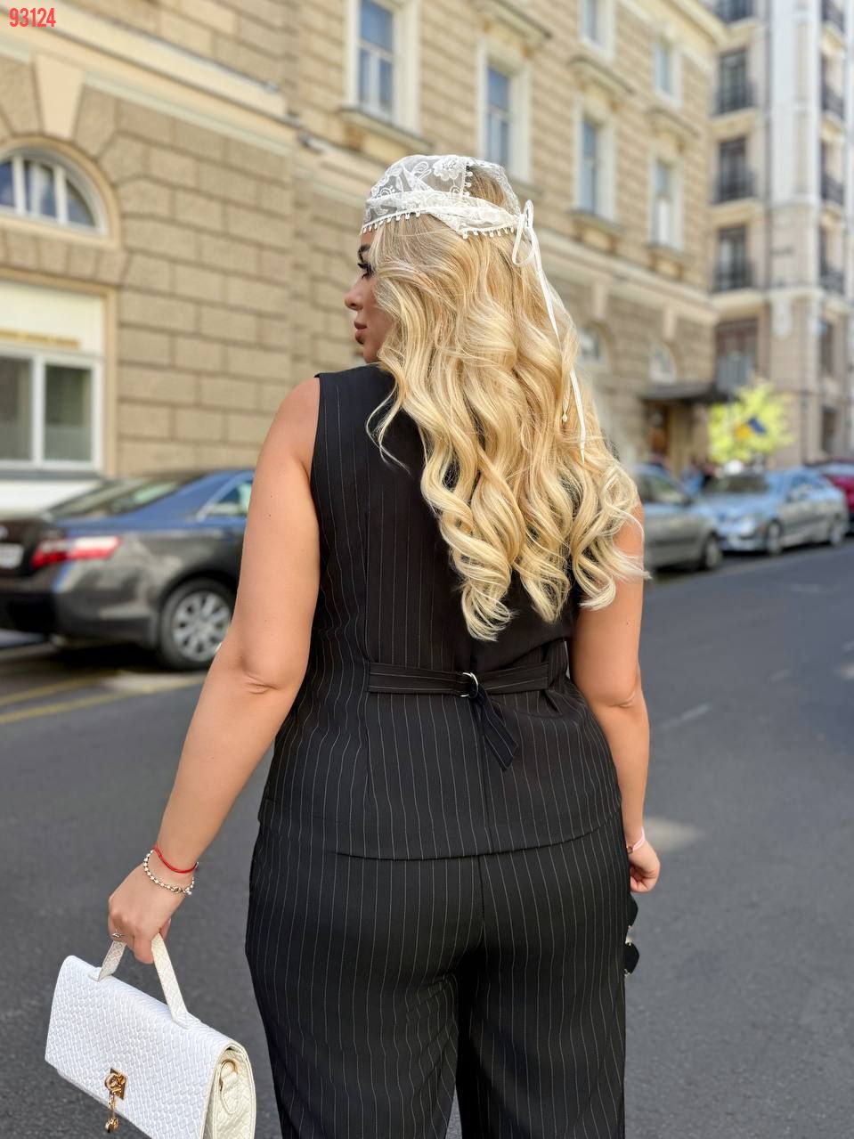 Ідеальний вибір для повсякденних образів та офісного стилю. Жилет доповнений декоративною з'ємною квіткою, яка додає жіночності, а штани забезпечують свободу рухів. Поєднується як з футболками, так і з класичними блузами.