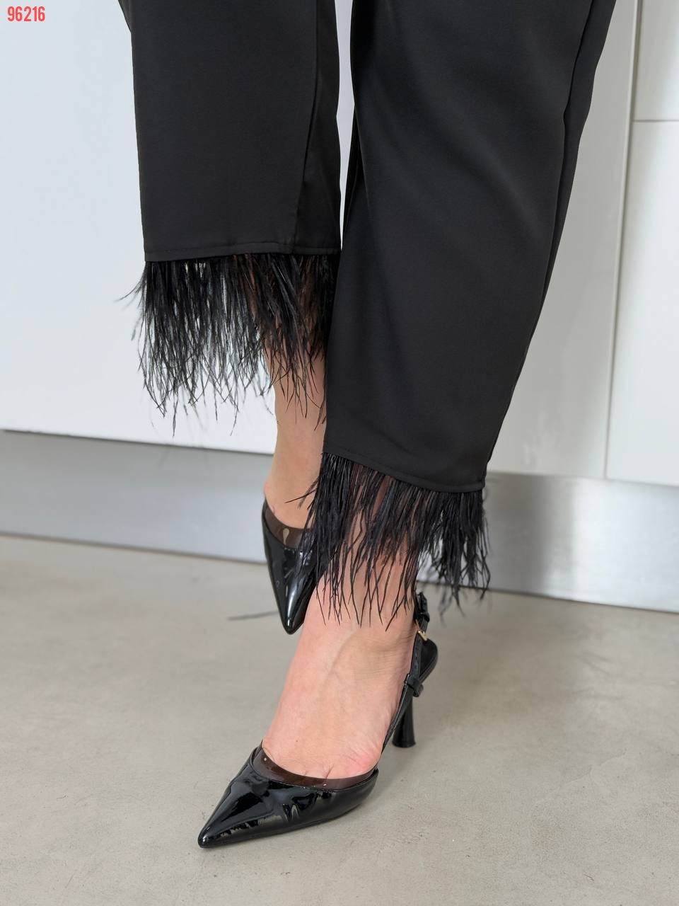 Штани високої посадки на комфортній гумціОздоблення – пір’я марабу