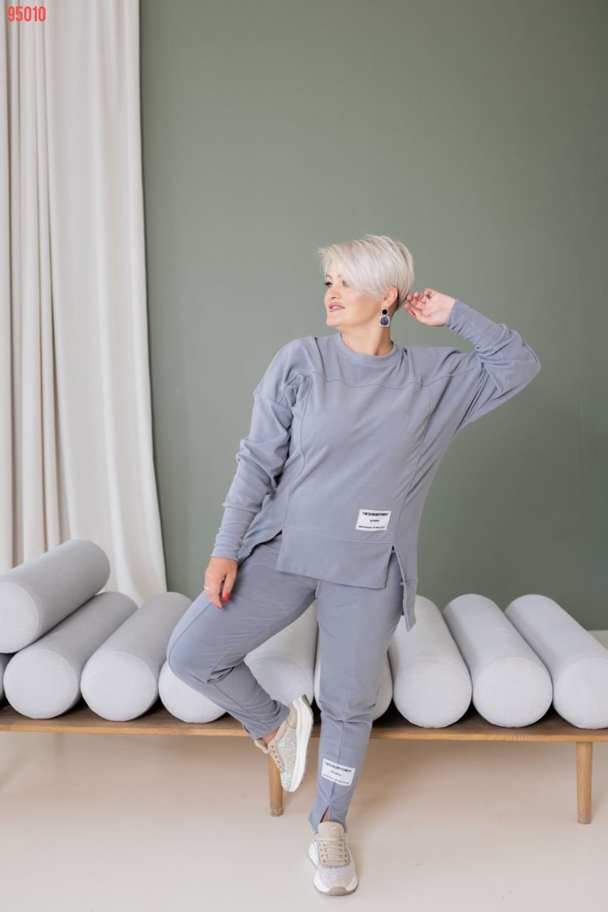 54-58 Кофта: Обхват грудей 124 см Обхват стегон 124 см Довжина кофти по короткій частині 69 см По довгій 80 Довжина рукава 74 см Штани: Обхват стегон 120 см (гарна розтяжність) Обхват талії 80/120 см (резинка) Довжина виробу 103 см