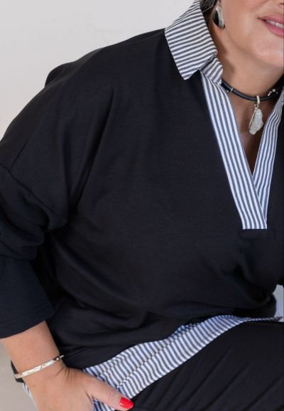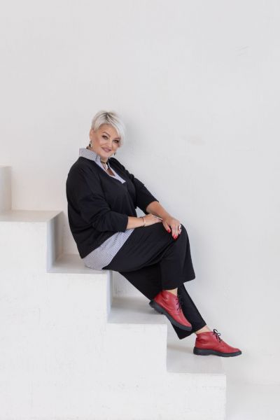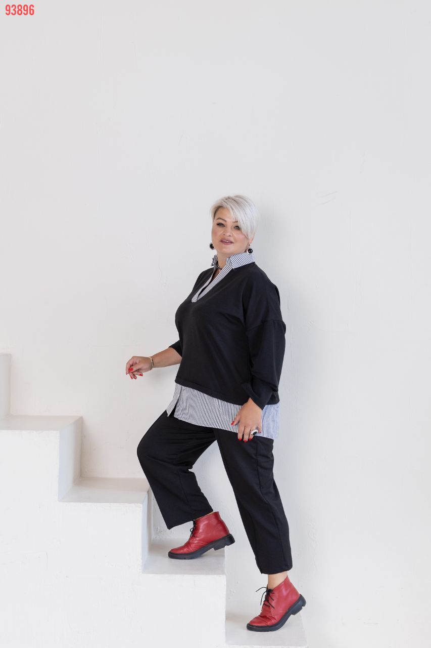 Стильний костюм виготовлений з якісної двунитки гарної розтяжності та котону. Подовжена туніка вільного крою, V-подібний виріз візуально звузить плечі і зробить фігуру стрункішою.